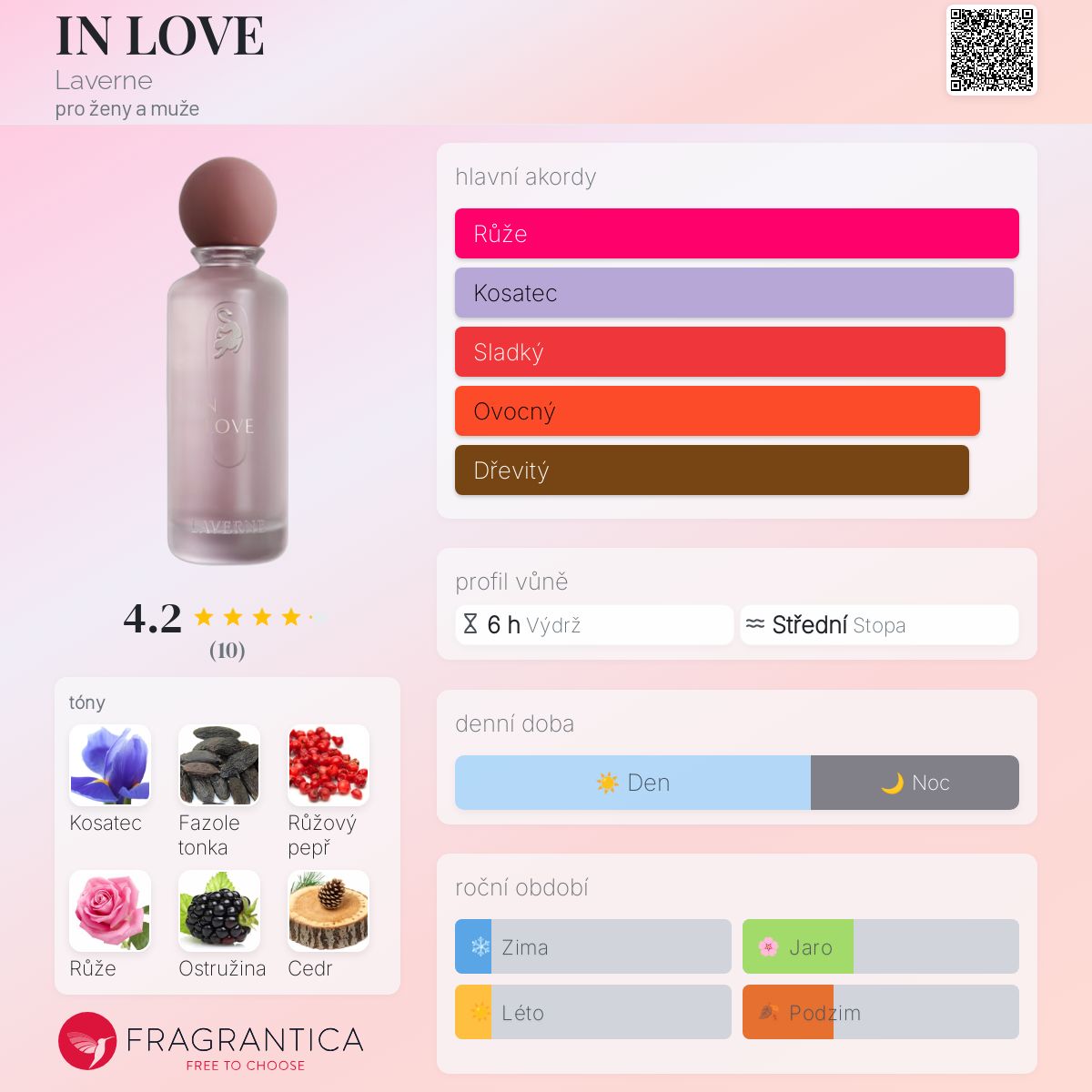 IN LOVE podle Laverne je Floral Fruity vůně pro ženy a muže. Toto je nová vůně. IN LOVE byl/a uveden/a v roce 2024. "Nosem" za touto vůní je Nathalie Lorson. Vrchní tóny jsou Růžový pepř, Ostružina a Broskev; střední tóny jsouKosatec, Damašská růže a Jasmín ; základní tóny jsou Fazole tonka a Cedr.