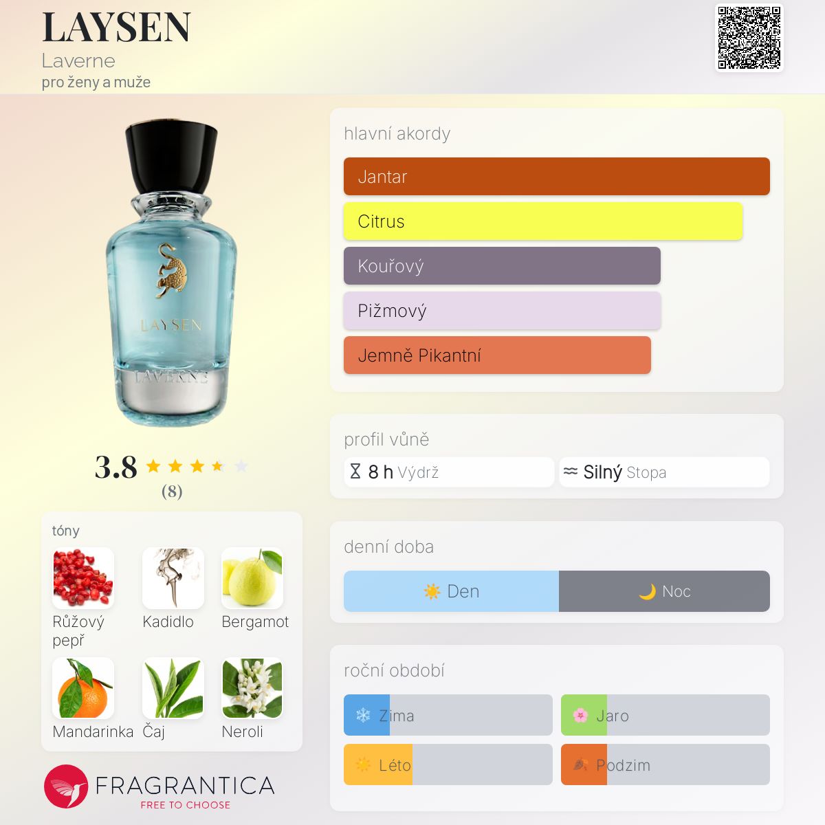 LAYSEN podle Laverne je Woody Floral Musk vůně pro ženy a muže. LAYSEN byl/a uveden/a v roce 2023. "Nosem" za touto vůní je Christian Provenzano. Vrchní tóny jsou Růžový pepř, Bergamot a Mandarinka; střední tóny jsouČerný čaj a Neroli ; základní tóny jsou Kadidlo, Santalové dřevo, Jantar (ambra) a Pižmo.