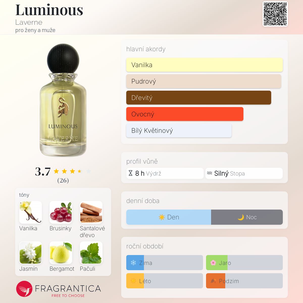 Luminous podle Laverne je Orientální Vanilla vůně pro ženy a muže. Luminous byl/a uveden/a v roce 2021. Vrchní tóny jsou Brusinky, Jasmín a Bergamot; střední tóny jsouPačuli a Fialka ; základní tóny jsou Vanilka, Santalové dřevo a Pižmo.