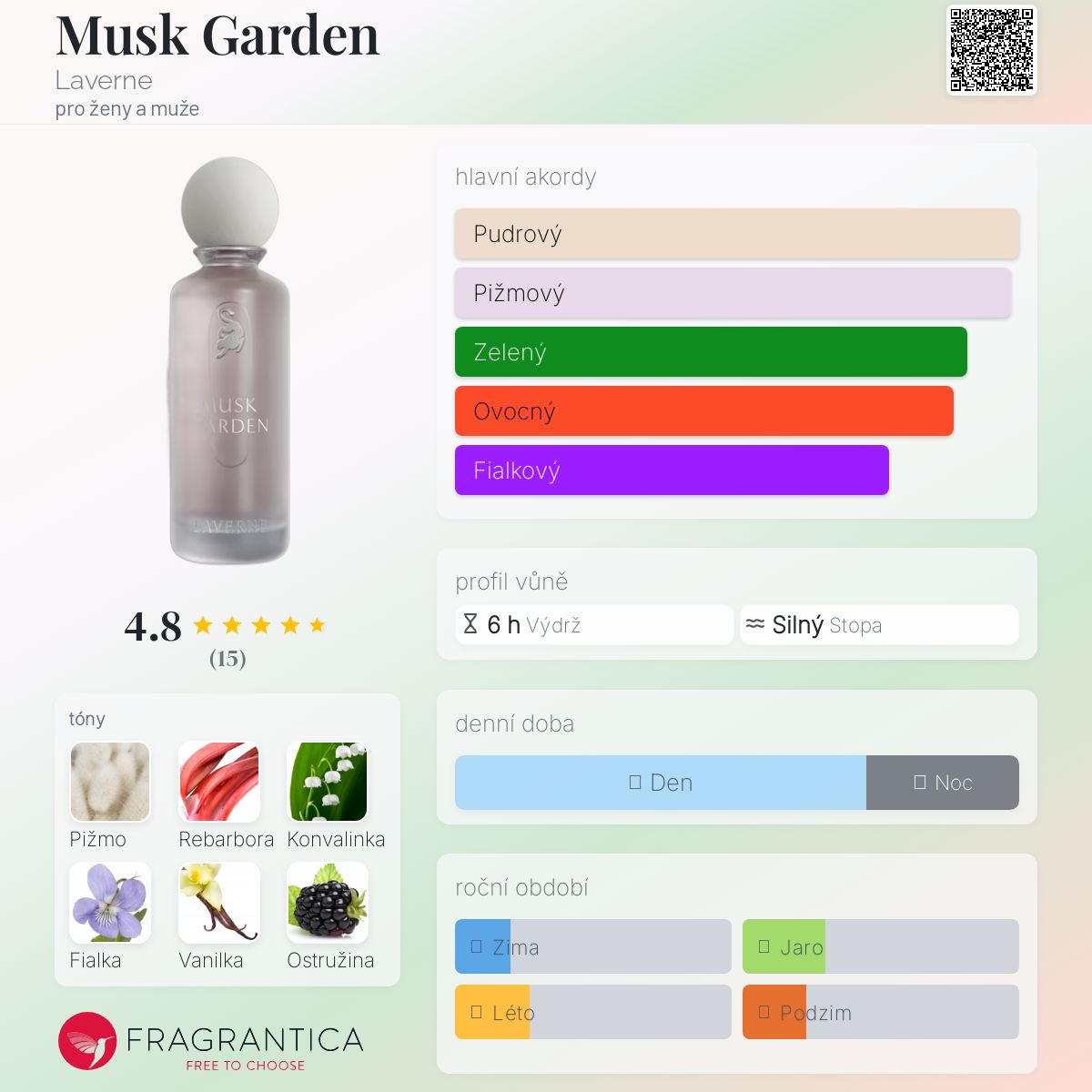 Musk Garden podle Laverne je Floral Fruity vůně pro ženy a muže. Toto je nová vůně. Musk Garden byl/a uveden/a v roce 2024. "Nosem" za touto vůní je Nathalie Lorson. Vrchní tóny jsou Rebarbora, Ostružina, Jablko a Broskev; střední tóny jsouPižmo, Konvalinka, Fialka a Růže ; základní tóny jsou Pižmo, Vanilka a Santalové dřevo.