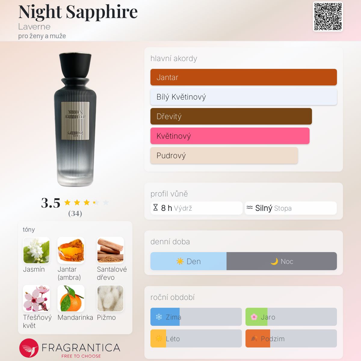 Night Sapphire podle Laverne je Floral Woody Musk vůně pro ženy a muže. Toto je nová vůně. Night Sapphire byl/a uveden/a v roce 2024. Vrchní tóny jsou Jasmín a Třešňový květ; střední tóny jsouMandarinka a Muškátový oříšek ; základní tóny jsou Jantar (ambra), Santalové dřevo a Bílé pižmo.