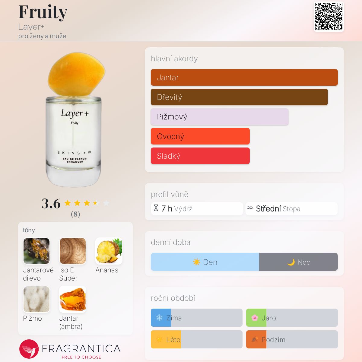 Fruity podle Layer+ je Floral Fruity Gourmand vůně pro ženy a muže. Toto je nová vůně. Fruity byl/a uveden/a v roce 2025. "Nosem" za touto vůní je IFF.