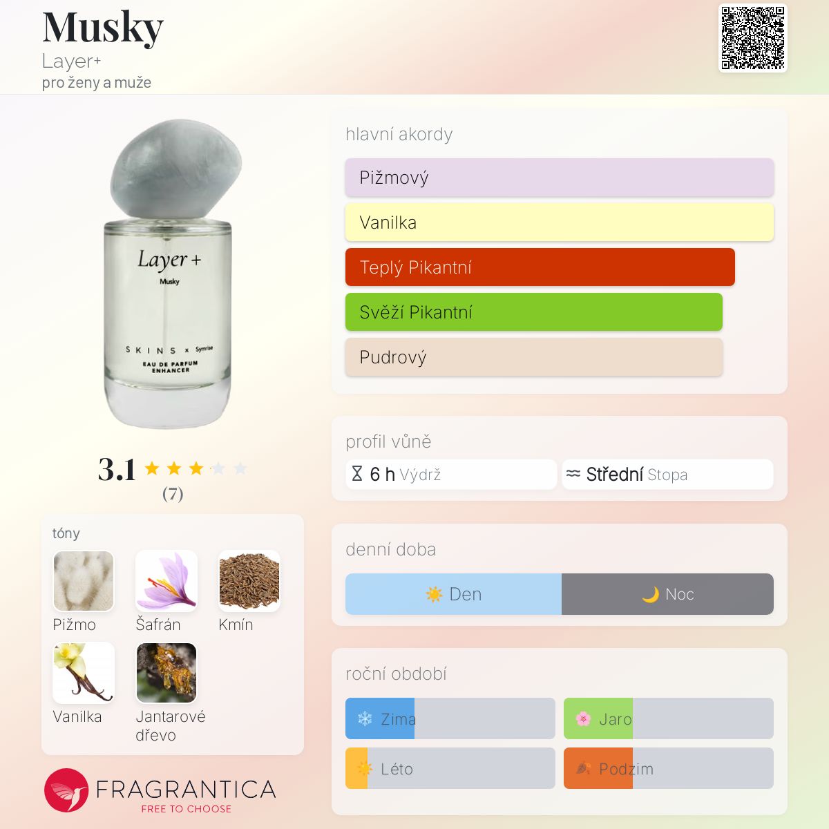 Musky podle Layer+ je vůně pro ženy a muže. Toto je nová vůně. Musky byl/a uveden/a v roce 2025. "Nosem" za touto vůní je Symrise.