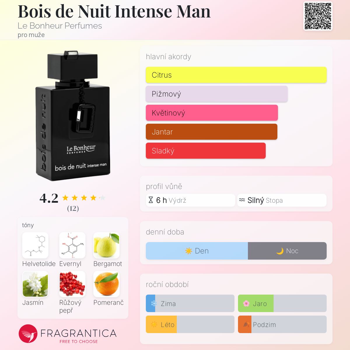 Bois de Nuit Intense Man podle Le Bonheur Perfumes je Chypre Fruity vůně pro muže. Toto je nová vůně. Bois de Nuit Intense Man byl/a uveden/a v roce 2024. Vrchní tóny jsou Bergamot, Růžový pepř, Pomerančový olej, Ananas, Citrón a Jablko; střední tóny jsouJasmín, Frézie, Levandule a Růže ; základní tóny jsou Helvetolide, Evernyl, Ambrettolide, Ambroxan, Pižmo, Pačuli, Jantar (ambra) a Vanilka.