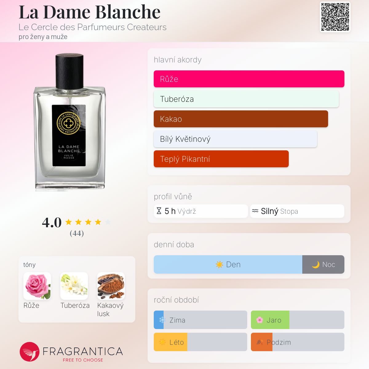 La Dame Blanche podle Le Cercle des Parfumeurs Createurs je Orientální Floral vůně pro ženy a muže. La Dame Blanche byl/a uveden/a v roce 2013. "Nosem" za touto vůní je Julie Massé. Vrchní tón je Růže ; střední tón jeTuberóza ; základní tón je Kakao.