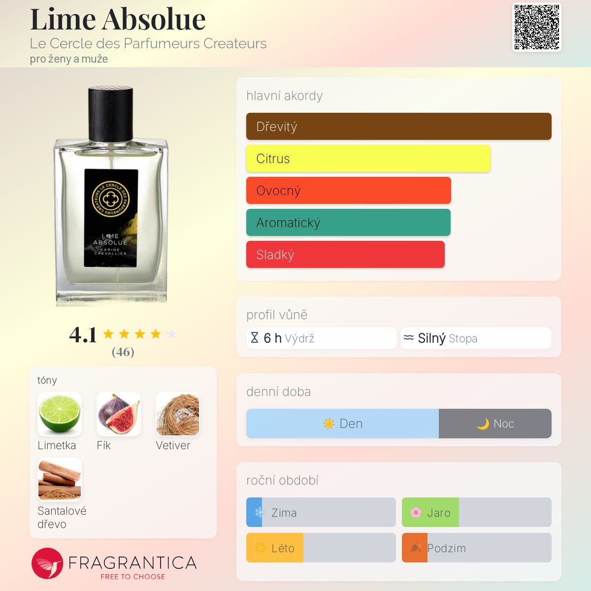 Lime Absolue podle Le Cercle des Parfumeurs Createurs je Citrus vůně pro ženy a muže. Lime Absolue byl/a uveden/a v roce 2014. "Nosem" za touto vůní je Karine Chevallier. Vrchní tón je Limetka ; střední tóny jsouFík a Vetiver ; základní tón je Santalové dřevo.