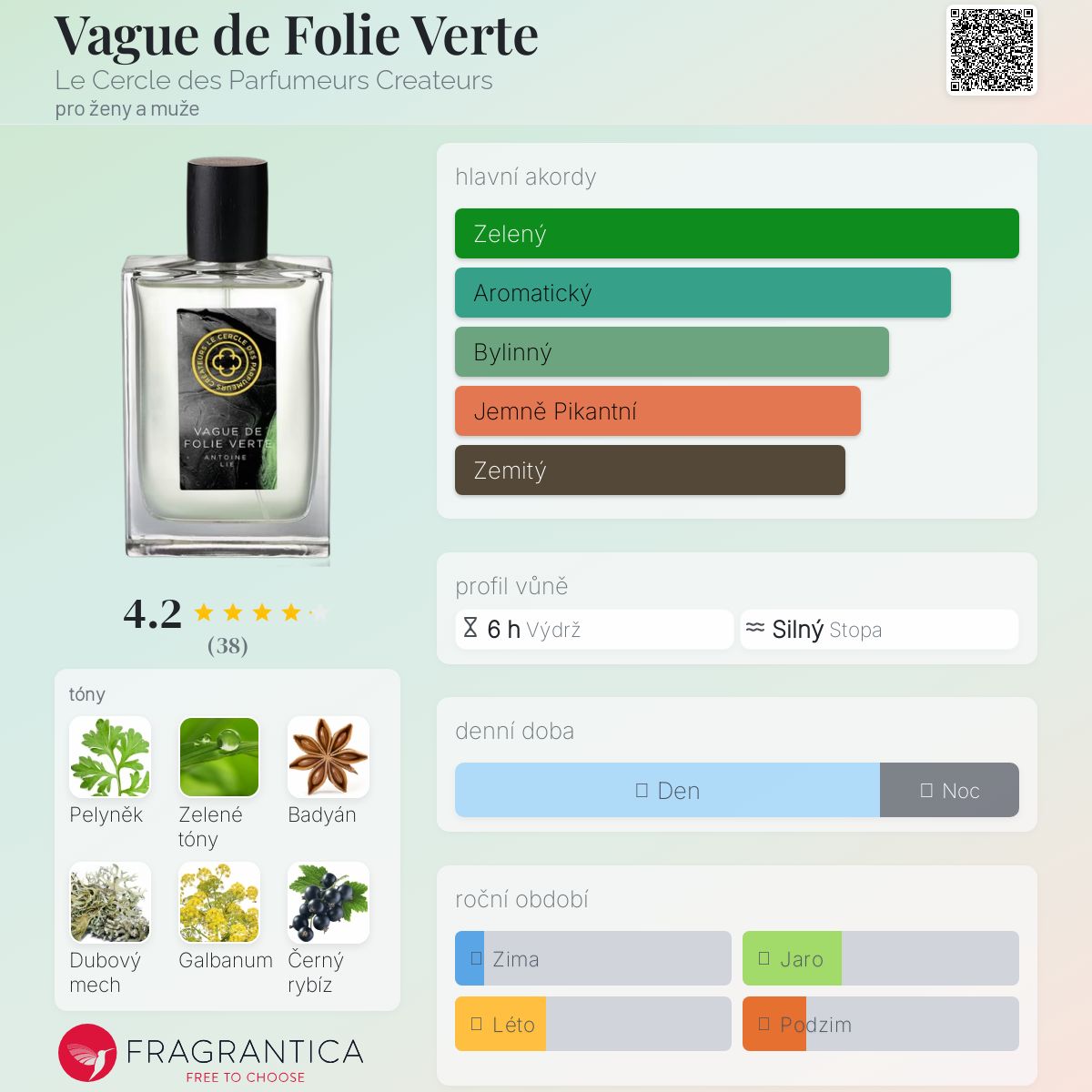 Vague de Folie Verte podle Le Cercle des Parfumeurs Createurs je Aromatic Green vůně pro ženy a muže. Vague de Folie Verte byl/a uveden/a v roce 2014. "Nosem" za touto vůní je Antoine Lie. Vrchní tóny jsou Zelené listí, Pelyněk a Badyán; střední tóny jsouDubový mech, Galbanum a Černý rybíz ; základní tóny jsou Vetiver a Pižmo.