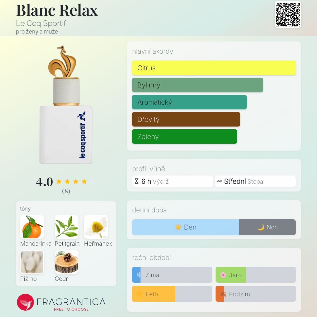 Blanc Relax podle Le Coq Sportif je Citrus Aromatic vůně pro ženy a muže. Toto je nová vůně. Blanc Relax byl/a uveden/a v roce 2024. "Nosem" za touto vůní je Emilie Bouge. Vrchní tón je Mandarinka ; střední tóny jsouMandarinkový list a Heřmánek ; základní tóny jsou Pižmo a Cedr.