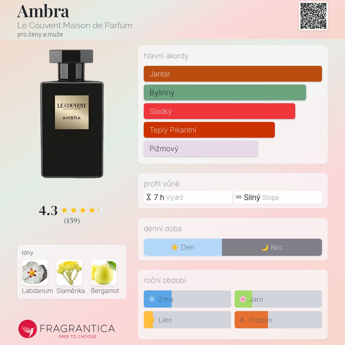 Ambra podle Le Couvent Maison de Parfum je Orientální Floral vůně pro ženy a muže. Ambra byl/a uveden/a v roce 2021. "Nosem" za touto vůní je Jean-Claude Ellena. Vrchní tón je Bergamot ; střední tón jeSlaměnka ; základní tón je Labdanum.
