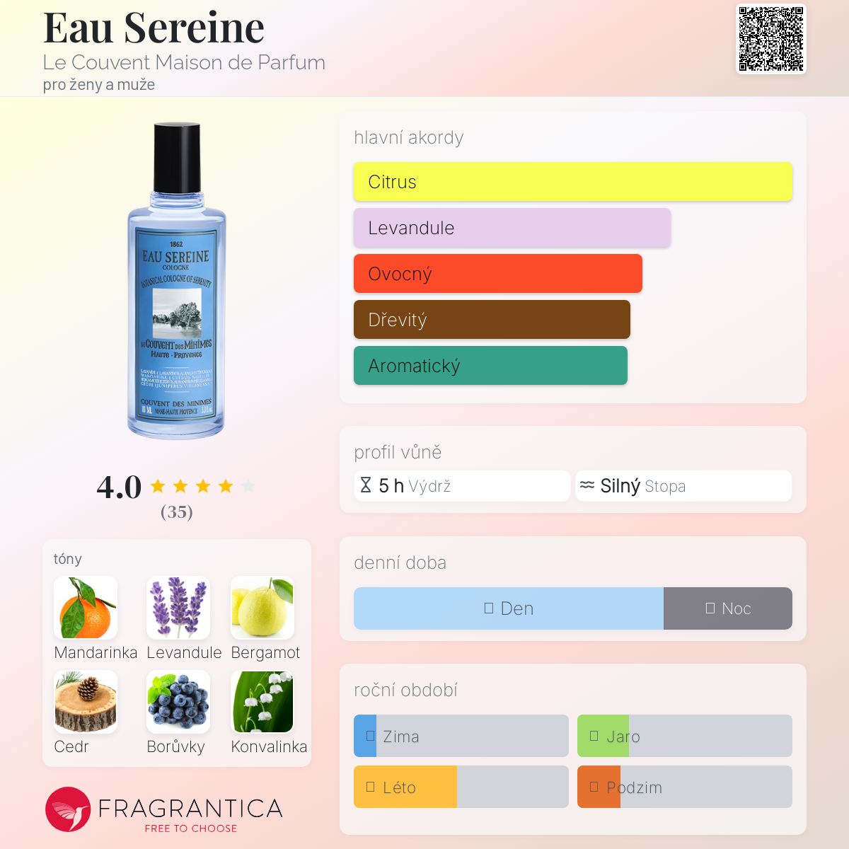Eau Sereine podle Le Couvent Maison de Parfum je Aromatic vůně pro ženy a muže. Eau Sereine byl/a uveden/a v roce 2016. Vrchní tóny jsou Mandarinka, Levandule a Bergamot; střední tóny jsouBorůvky, Konvalinka a Růže ; základní tón je Cedr.