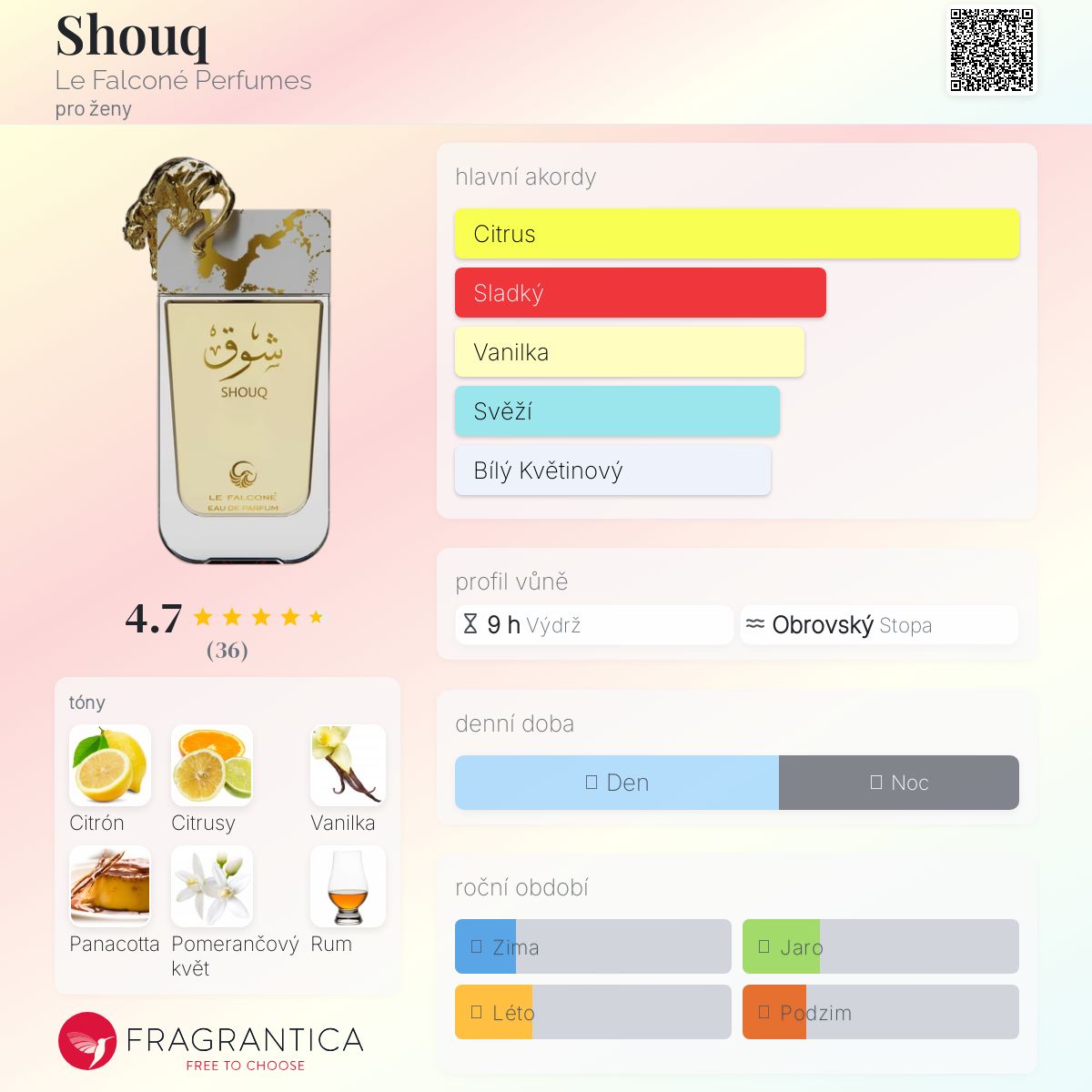 Shouq podle Le Falconé Perfumes je Citrus Gourmand vůně pro ženy. Shouq byl/a uveden/a v roce 2023. Vrchní tóny jsou Citrón a Citrusy s cukrem; střední tóny jsouPanacotta, Pomerančový květ a Rum ; základní tón je Vanilka.