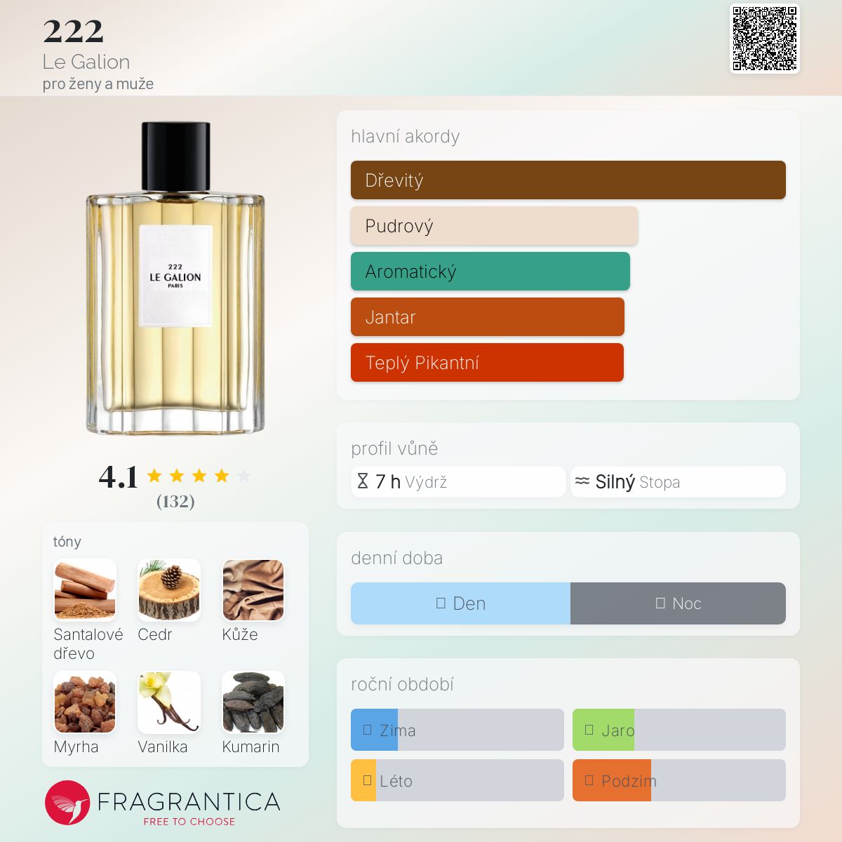 222 podle Le Galion je Orientální Fougere vůně pro ženy a muže. 222 byl/a uveden/a v roce 2014. "Nosem" za touto vůní je David Maruitte. Vrchní tón je Fialka ; střední tóny jsouMyrha, Styrax, Levandule a Pelargónie ; základní tóny jsou Santalové dřevo, Cedr, Kůže, Vanilka, Kumarin a Dubový mech.