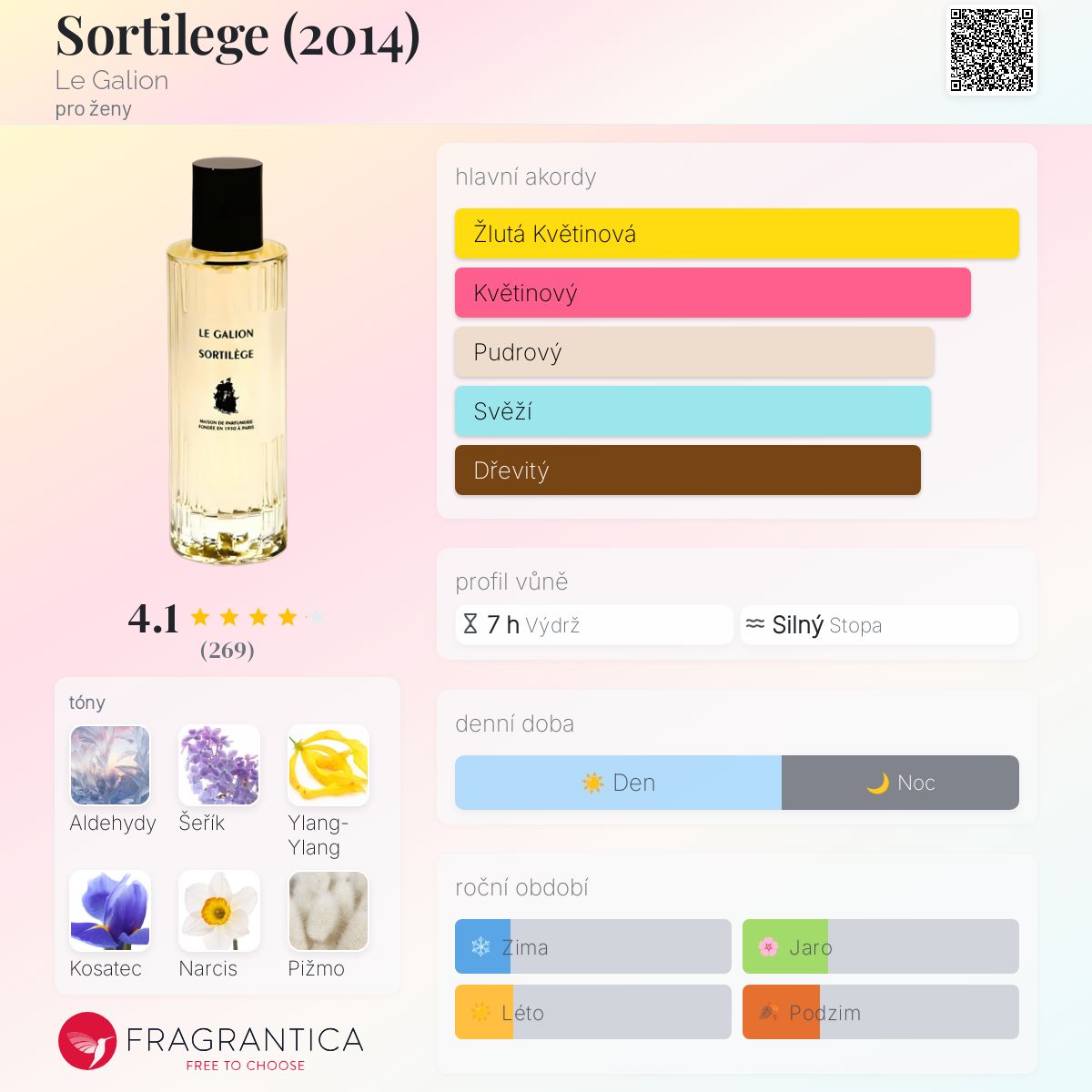 Sortilege (2014) podle Le Galion je Floral Aldehyde vůně pro ženy. Sortilege (2014) byl/a uveden/a v roce 2014. "Nosem" za touto vůní je Marie Duchêne. Vrchní tóny jsou Aldehydy, Šeřík, Ylang-Ylang a Konvalinka; střední tóny jsouKosatec, Narcis, Mimóza, Jasmín a Růže ; základní tóny jsou Pižmo, Santalové dřevo, Labdanum, Jantar (ambra) a Vetiver.