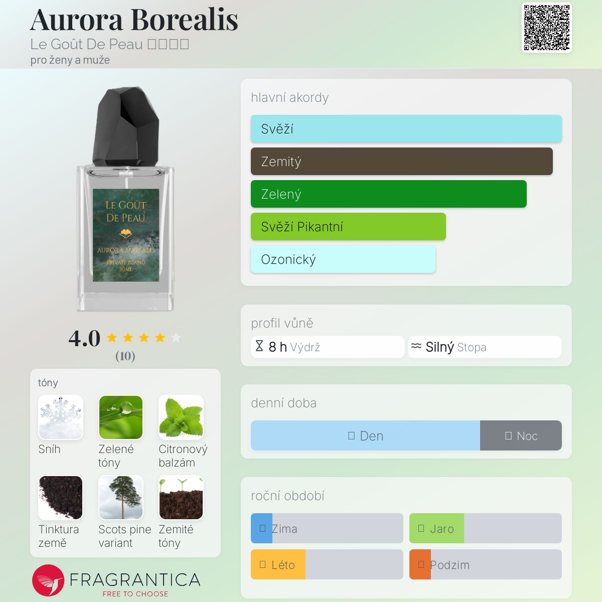 Aurora Borealis 北境极光 podle Le Goût De Peau 肌肤之味 je vůně pro ženy a muže. Aurora Borealis 北境极光 byl/a uveden/a v roce 2022. Vrchní tóny jsou Sníh a Citronový balzám; střední tóny jsouScots pine variant, Zelený čaj, Zimolez, Jedle a Jehličí borovice ; základní tóny jsou Sníh, Bylinné tóny, Půdní tinktura a Zemité tóny.