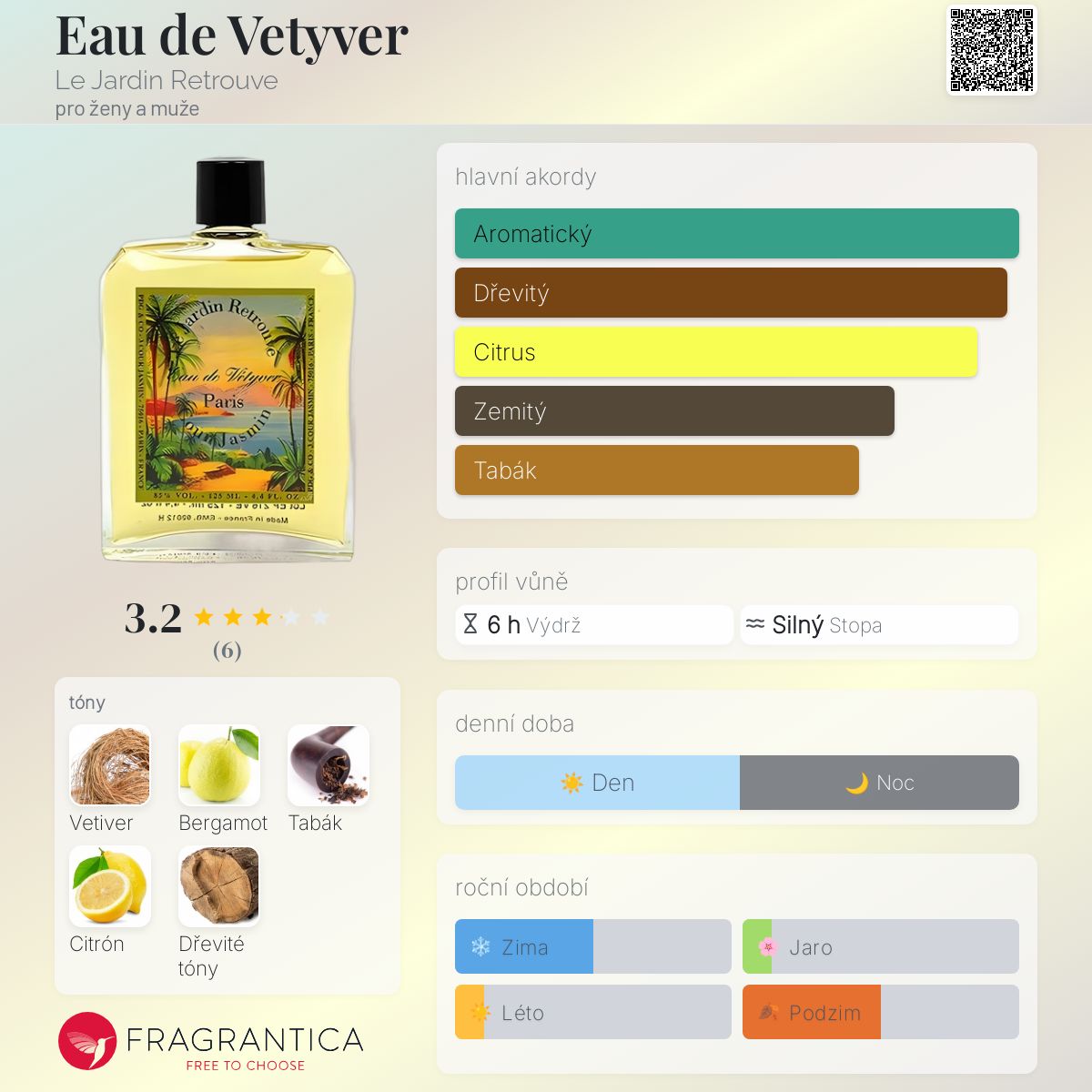 Eau de Vetyver podle Le Jardin Retrouve je Woody vůně pro ženy a muže. "Nosem" za touto vůní je Yuri Gutsatz. Vrchní tóny jsou Bergamot a Citron amalfi; střední tón jeTabák ; základní tóny jsou Vetiver a Dřevité tóny.