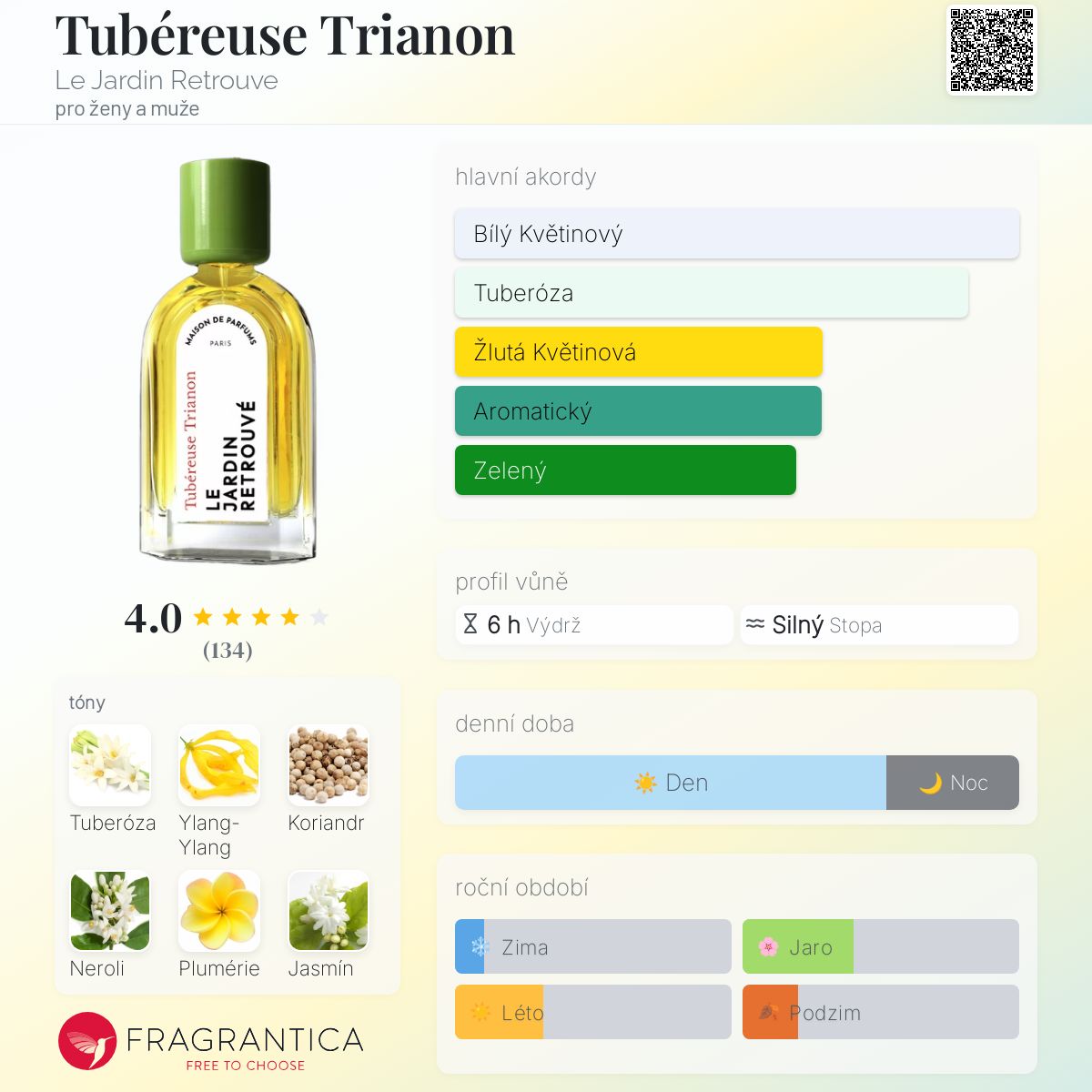 Tubéreuse Trianon podle Le Jardin Retrouve je Orientální Floral vůně pro ženy a muže. Tubéreuse Trianon byl/a uveden/a v roce 1985. "Nosem" za touto vůní je Yuri Gutsatz. Vrchní tóny jsou Koriandr, Rebarbora a Petitgrain; střední tóny jsouTuberóza, Ylang-Ylang, Neroli, Jasmín, Konvalinka a Hřebíček ; základní tóny jsou Plumérie, Kokos, Maliny a Peruánský balzám.