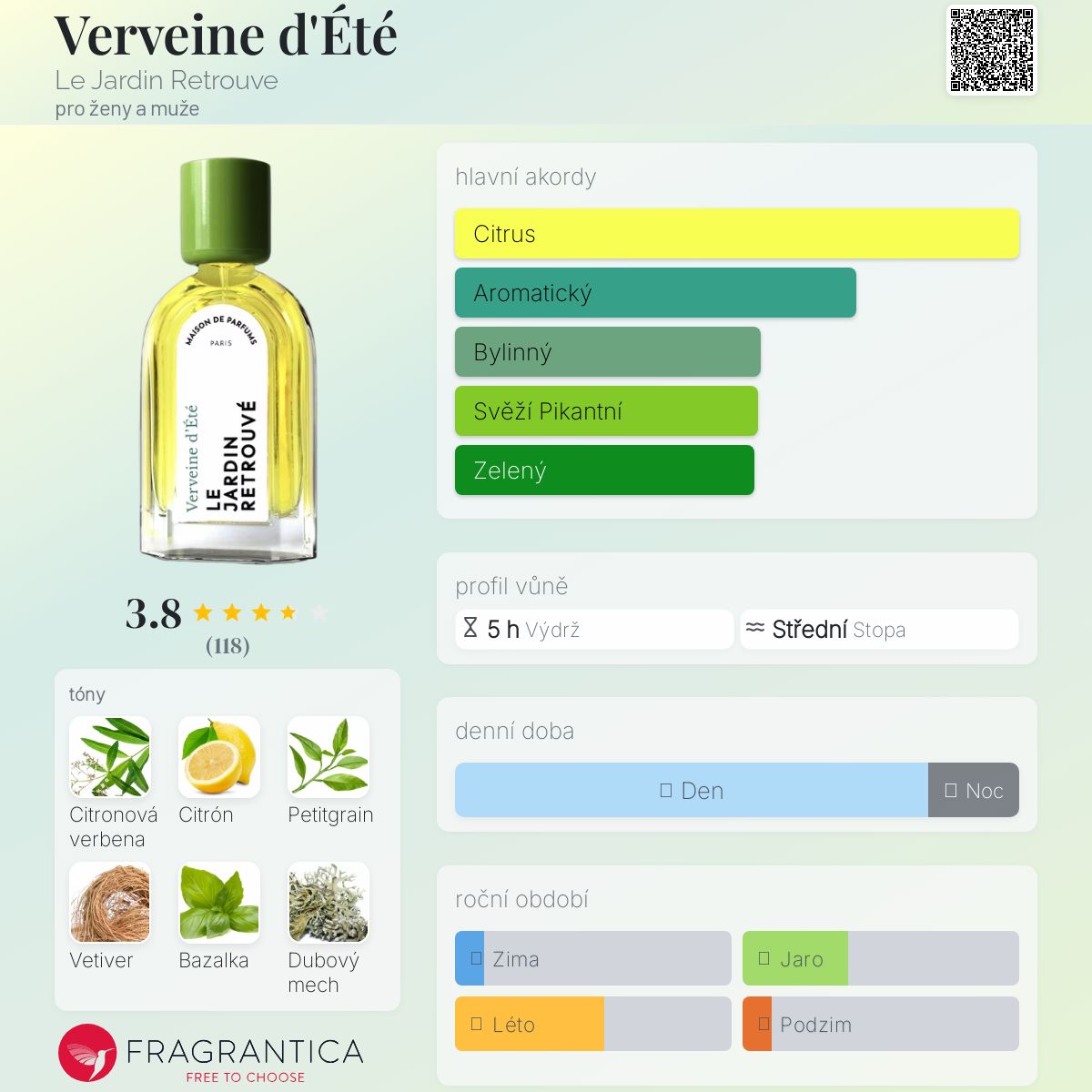 Verveine d'Été podle Le Jardin Retrouve je Aromatic vůně pro ženy a muže. Verveine d'Été byl/a uveden/a v roce 1978. "Nosem" za touto vůní je Yuri Gutsatz. Vrchní tóny jsou Sporýš, Citrón a Petitgrain; střední tóny jsouSporýš, Bazalka a Levandule ; základní tóny jsou Vetiver a Dubový mech.
