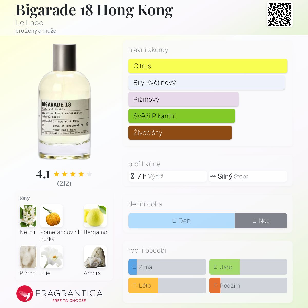 Bigarade 18 Hong Kong podle Le Labo je Citrus vůně pro ženy a muže. Bigarade 18 Hong Kong byl/a uveden/a v roce 2019. "Nosem" za touto vůní je Daphné Bugey. Vrchní tóny jsou Neroli, Pomerančovník hořký a Bergamot; střední tón jeLilie ; základní tóny jsou Pižmo, Ambra a Cedr.