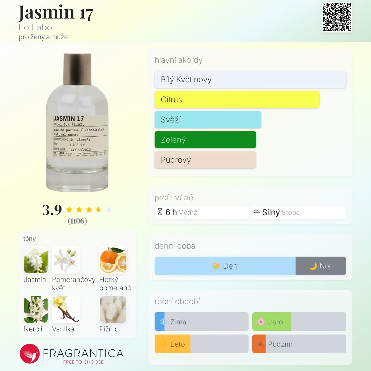 Jasmin 17 podle Le Labo je Floral Woody Musk vůně pro ženy a muže. Jasmin 17 byl/a uveden/a v roce 2006. "Nosem" za touto vůní je Maurice Roucel.