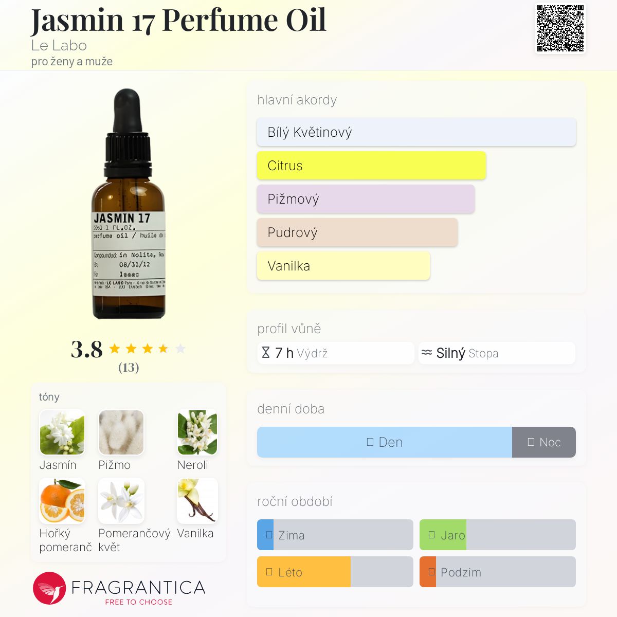 Jasmin 17 Perfume Oil podle Le Labo je Floral Woody Musk vůně pro ženy a muže. Jasmin 17 Perfume Oil byl/a uveden/a v roce 2012. "Nosem" za touto vůní je Maurice Roucel. Vrchní tóny jsou Neroli a Hořký pomeranč; střední tóny jsouJasmín a Pomerančový květ ; základní tóny jsou Pižmo, Vanilka, Jantar (ambra) a Santalové dřevo.