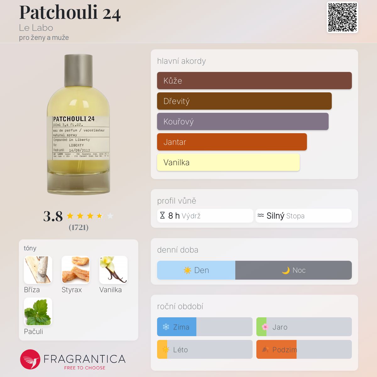 Patchouli 24 podle Le Labo je Woody Chypre vůně pro ženy a muže. Patchouli 24 byl/a uveden/a v roce 2006. "Nosem" za touto vůní je Annick Menardo. Vrchní tón je Pačuli ; střední tóny jsouBříza a Styrax ; základní tón je Vanilka.