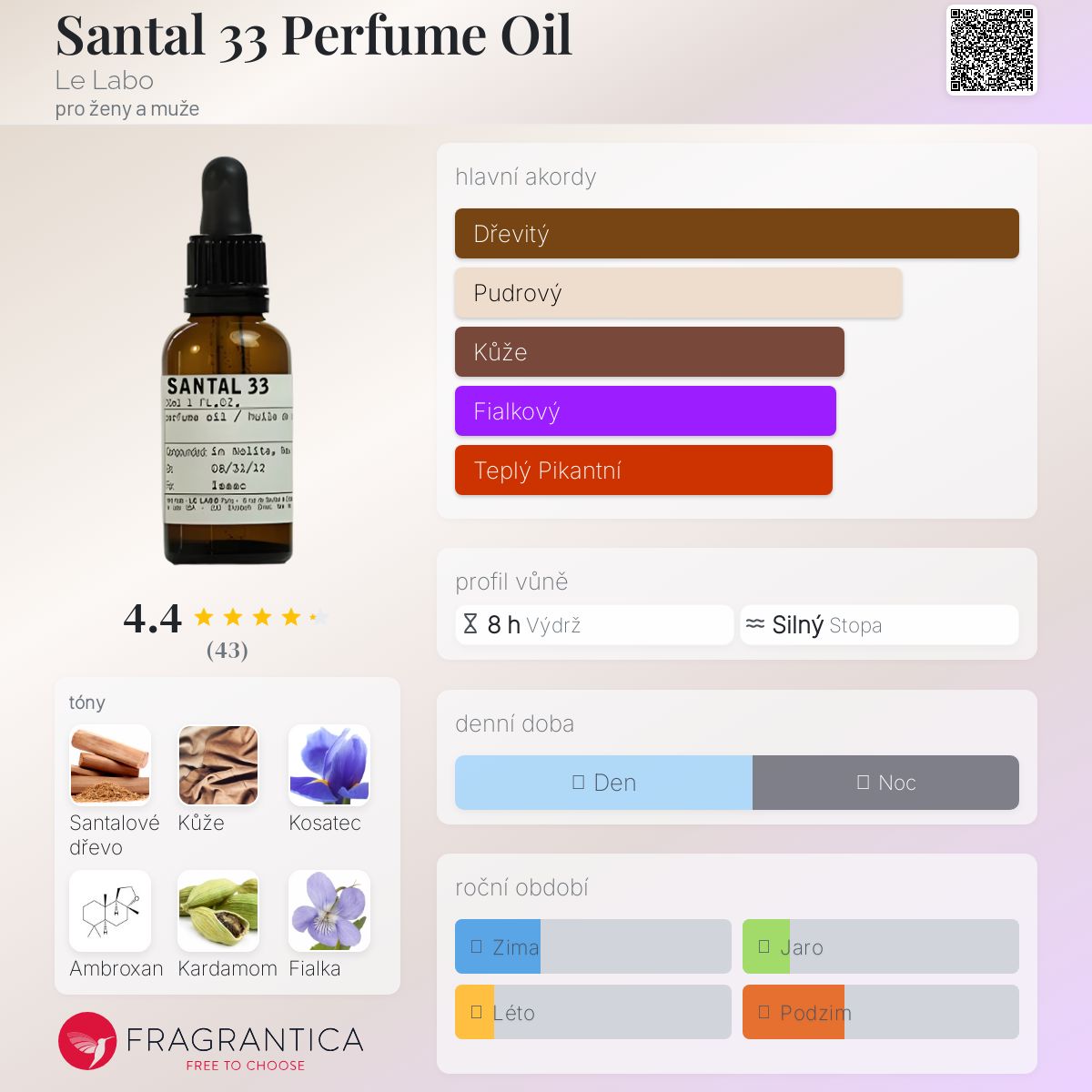 Santal 33 Perfume Oil podle Le Labo je Woody vůně pro ženy a muže. Santal 33 Perfume Oil byl/a uveden/a v roce 2012. "Nosem" za touto vůní je Frank Voelkl.