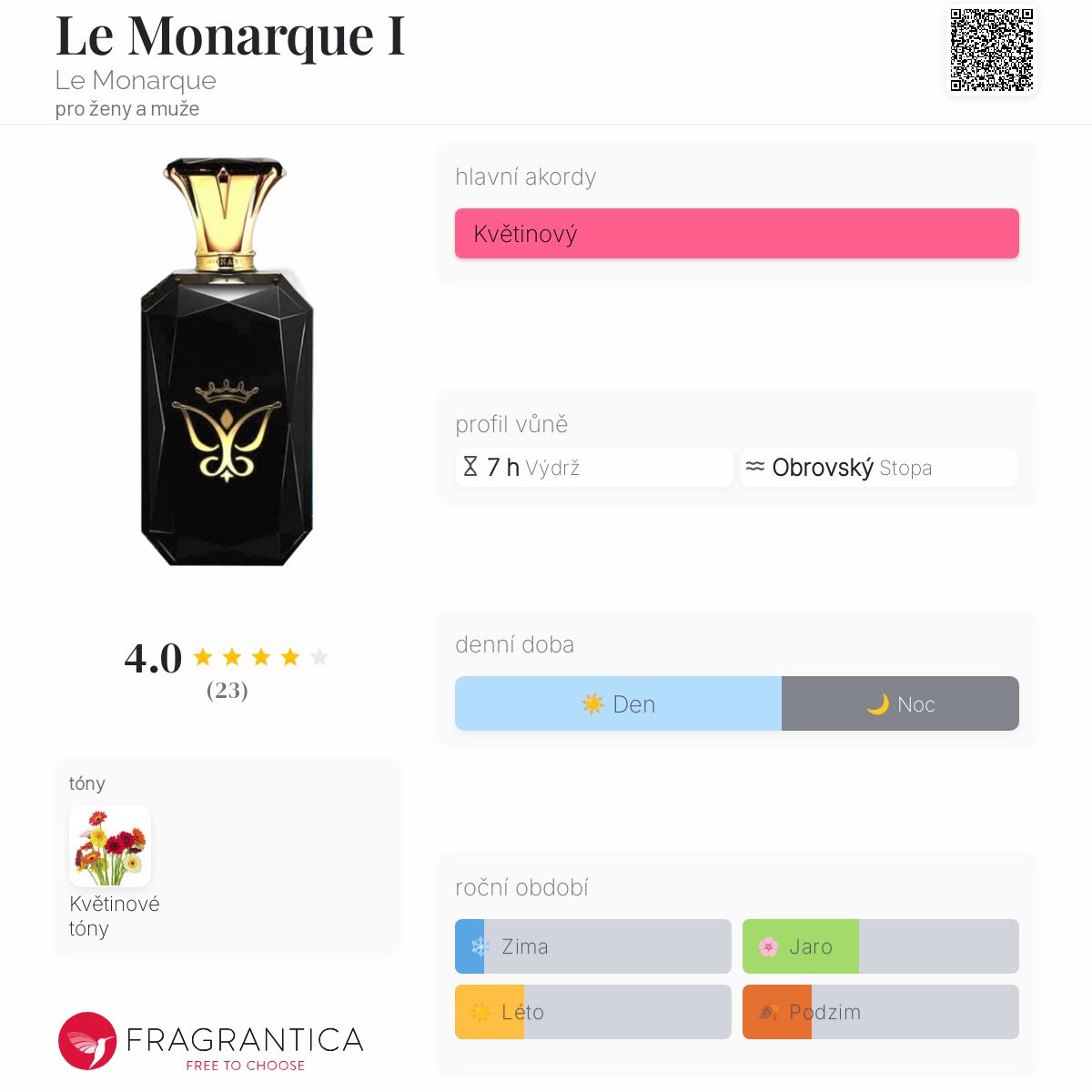 Le Monarque I podle Le Monarque je Floral vůně pro ženy a muže. Le Monarque I byl/a uveden/a v roce 2018. "Nosem" za touto vůní je Luca Maffei.