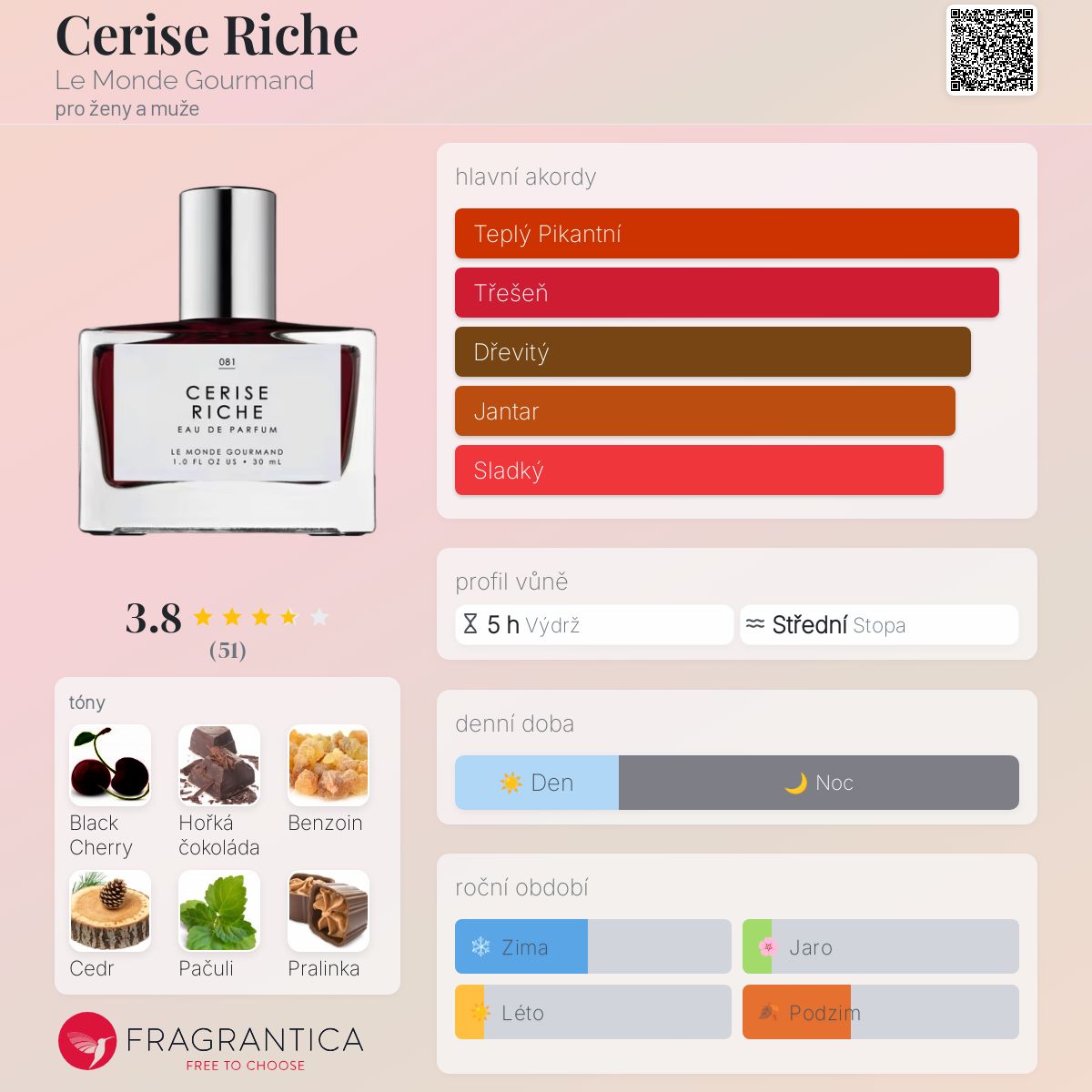 Cerise Riche podle Le Monde Gourmand je vůně pro ženy a muže. Cerise Riche byl/a uveden/a v roce 2024. Vrchní tóny jsou Černá třešeň, Hruškový list a Bergamot; střední tóny jsouHořká čokoláda, Benzoin, Davana a Siam ; základní tóny jsou Cedr, Pačuli a Pralinka.
