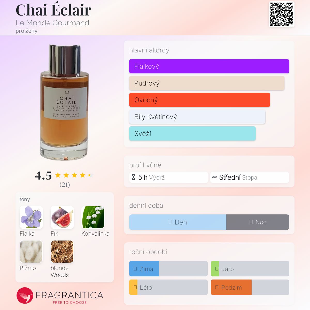 Chai Éclair podle Le Monde Gourmand je vůně pro ženy. Chai Éclair byla spuštěna během 2020. Vrchní tóny jsou Fialka a Fík; střední tóny jsouKonvalinka a Pižmo ; základní tón je Světlá dřeva.