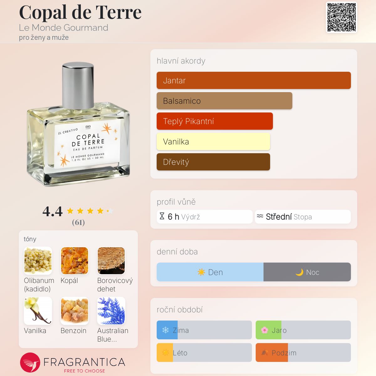 Copal de Terre podle Le Monde Gourmand je Woody Aromatic vůně pro ženy a muže. Toto je nová vůně. Copal de Terre byl/a uveden/a v roce 2025. "Nosem" za touto vůní je Juan Renteria. Vrchní tóny jsou Borovicový dehet, Australský modrý cypřišek a Elimi; střední tóny jsouKadidlo a Kopál ; základní tóny jsou Mexická vanilka, Benzoin a Peruánský balzám.