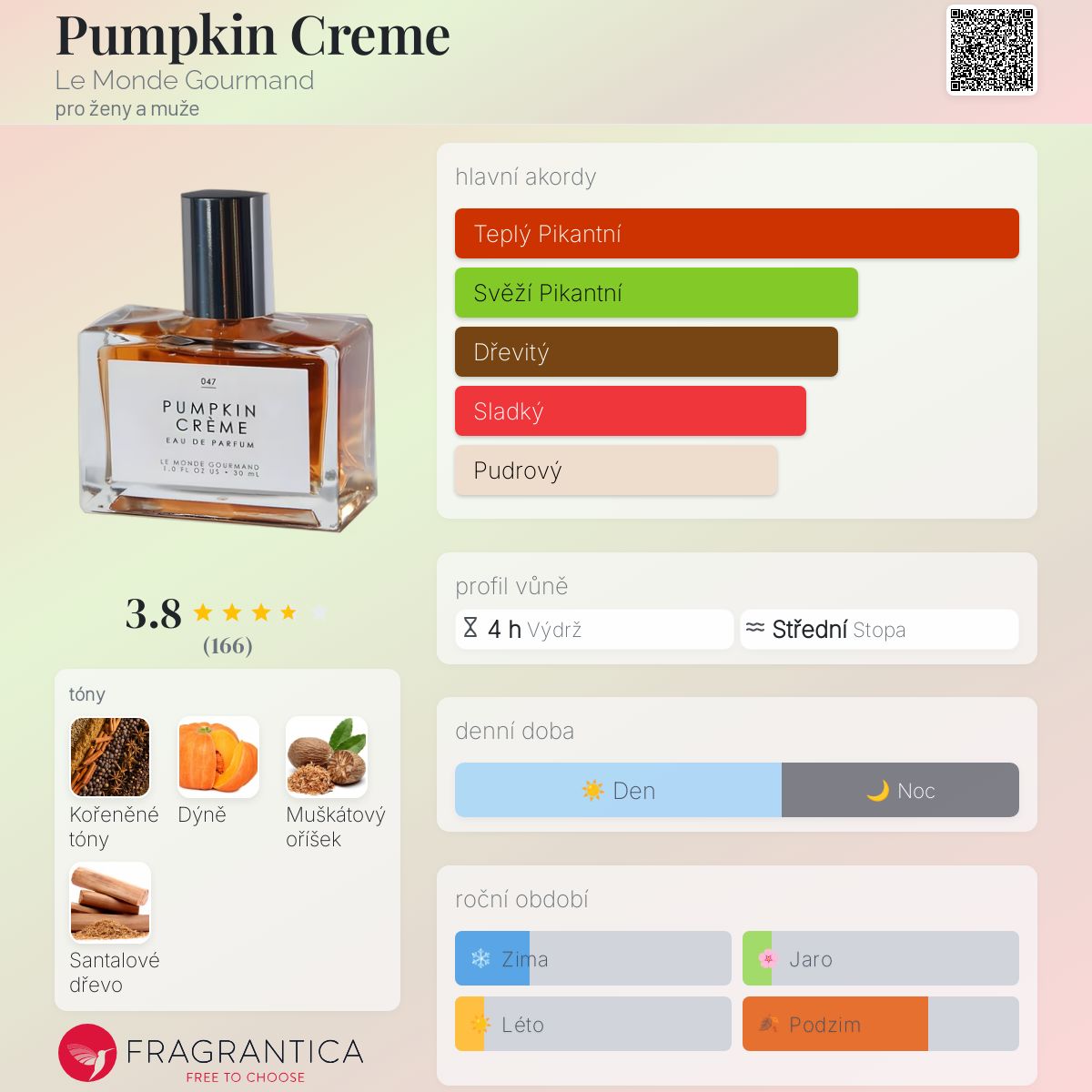 Pumpkin Creme podle Le Monde Gourmand je vůně pro ženy a muže. Vrchní tóny jsou Koření a Dýně; střední tón jeMuškátový oříšek ; základní tón je Santalové dřevo.