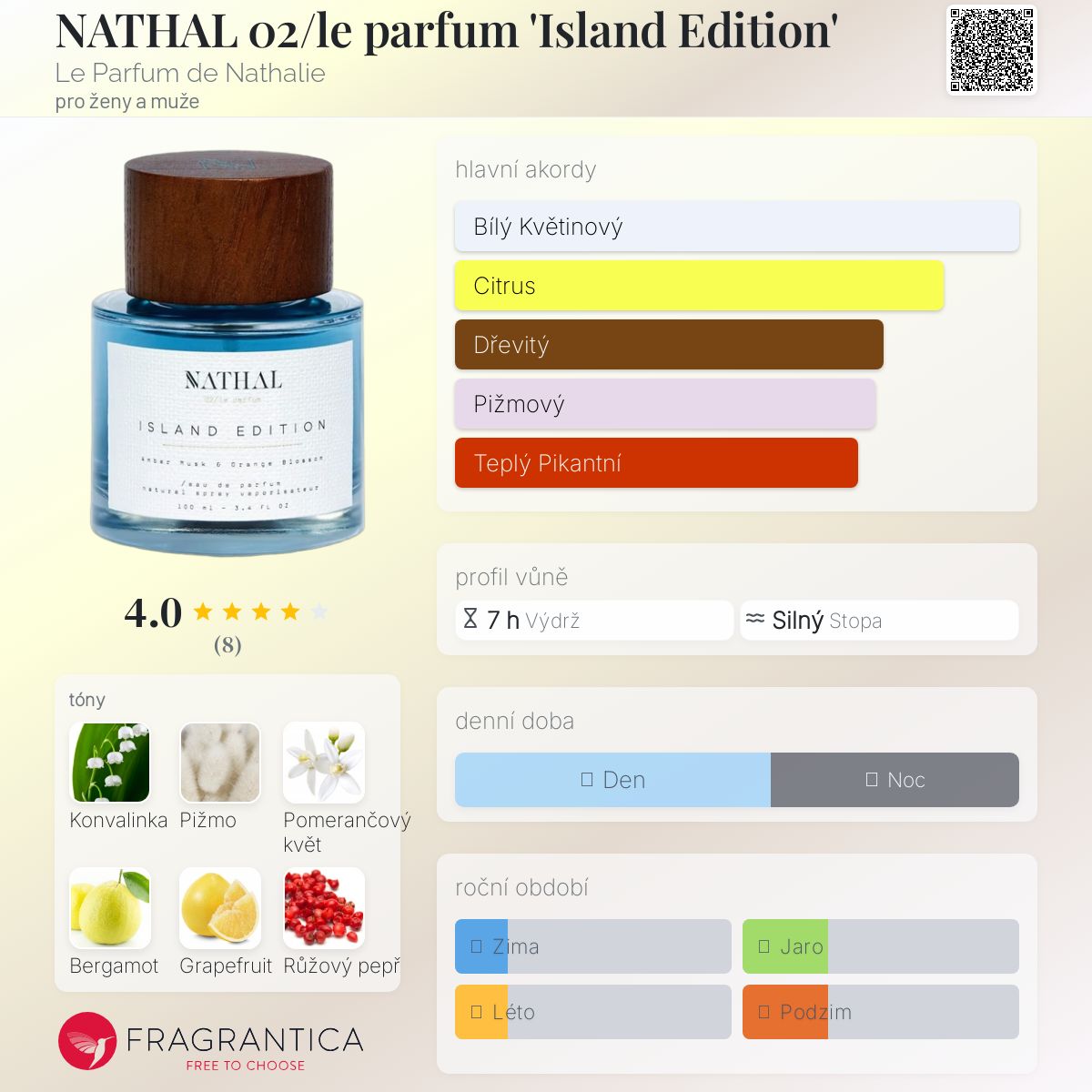 NATHAL 02/le parfum 'Island Edition' podle Le Parfum de Nathalie je Woody Spicy vůně pro ženy a muže. NATHAL 02/le parfum 'Island Edition' byl/a uveden/a v roce 2023. "Nosem" za touto vůní je Laura de Coninck. Vrchní tóny jsou Konvalinka, Bergamot, Grapefruit a Růžový pepř; střední tóny jsouBílé pižmo, Pomerančový květ a Růžová voda ; základní tóny jsou Benzoin, Vanilka, Haitský vetiver, List indonéského pačuli, Koření, Santalové dřevo a Agarové dřevo (oud).