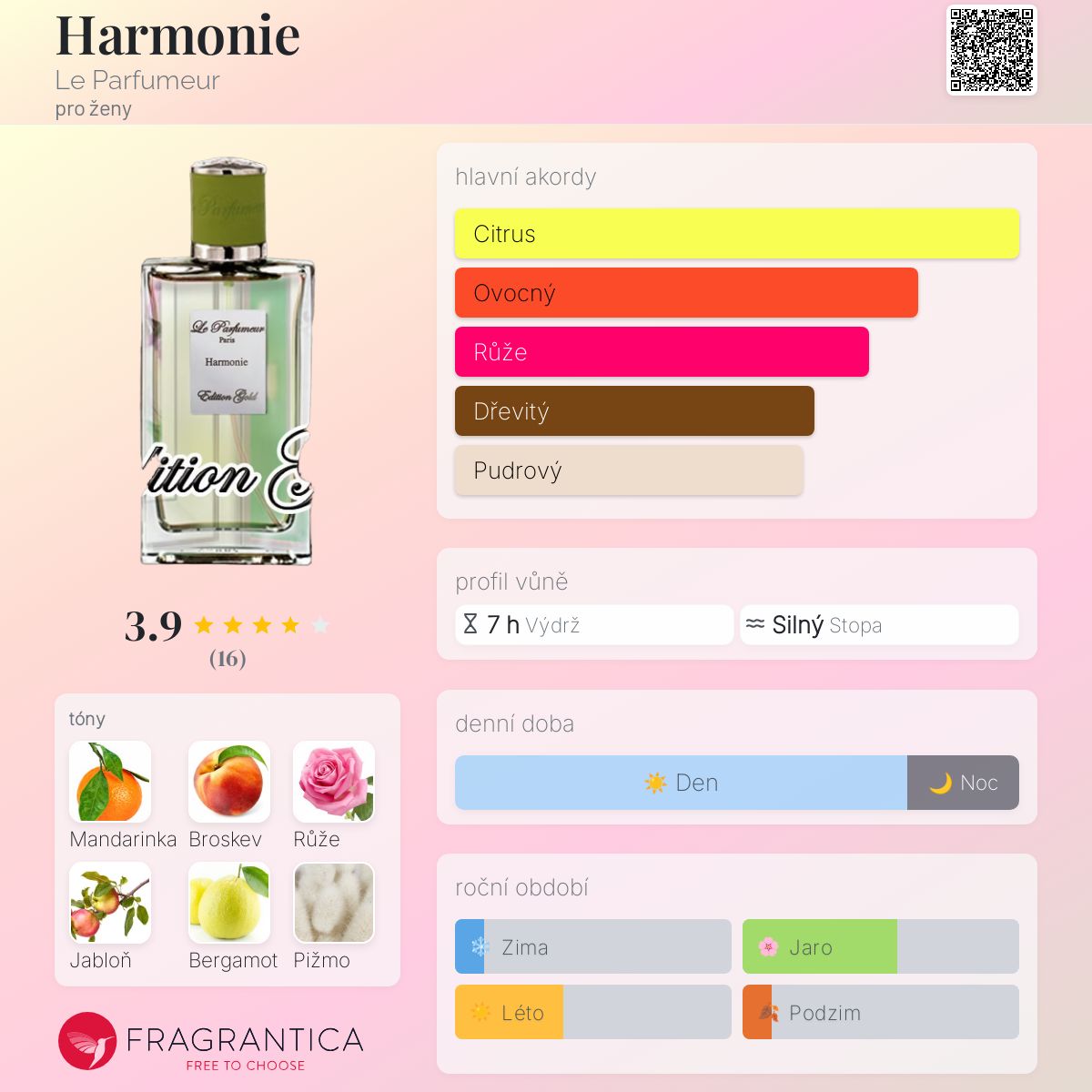 Harmonie podle Le Parfumeur je Floral Fruity vůně pro ženy. Harmonie byl/a uveden/a v roce 2013. "Nosem" za touto vůní je Robert Romanille. Vrchní tóny jsou Mandarinka a Bergamot; střední tóny jsouBroskev, Bílá růže, Jasmín a Kosatec ; základní tóny jsou Jabloň, Pižmo a Vanilka.