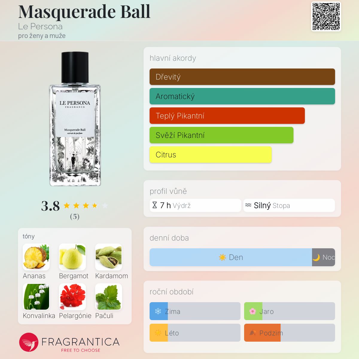 Masquerade Ball podle Le Persona je Woody Aromatic vůně pro ženy a muže. Toto je nová vůně. Masquerade Ball byl/a uveden/a v roce 2025. "Nosem" za touto vůní je Steve Guo. Vrchní tóny jsou Ananas, Bergamot a Kardamom; střední tóny jsouKonvalinka a Pelargónie ; základní tóny jsou Pačuli, Cedr, Vetiver a Pižmo.