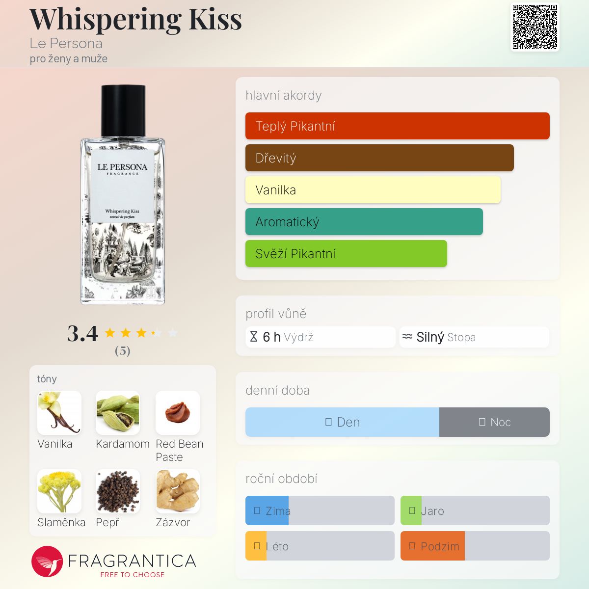 Whispering Kiss podle Le Persona je Orientální Spicy vůně pro ženy a muže. Toto je nová vůně. Whispering Kiss byl/a uveden/a v roce 2025. "Nosem" za touto vůní je Ilias Ermenidis. Vrchní tóny jsou Kardamom, Slaměnka, Pepř a Zázvor; střední tóny jsouRed Bean Paste, Koňak, Šalvěj a Rum ; základní tóny jsou Vanilka, Pačuli, Vetiver, Jantar (ambra) a Dřevité tóny.