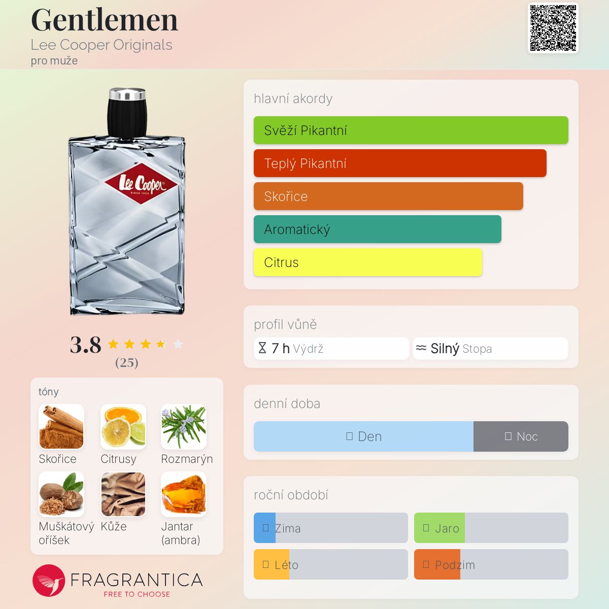Gentlemen podle Lee Cooper Originals je Orientální Spicy vůně pro muže. Gentlemen byl/a uveden/a v roce 2010. Vrchní tóny jsou Citrusy, Rozmarýn a Kardamom; střední tóny jsouSkořice, Muškátový oříšek a Zázvor ; základní tóny jsou Kůže, Jantar (ambra) a Pižmo.