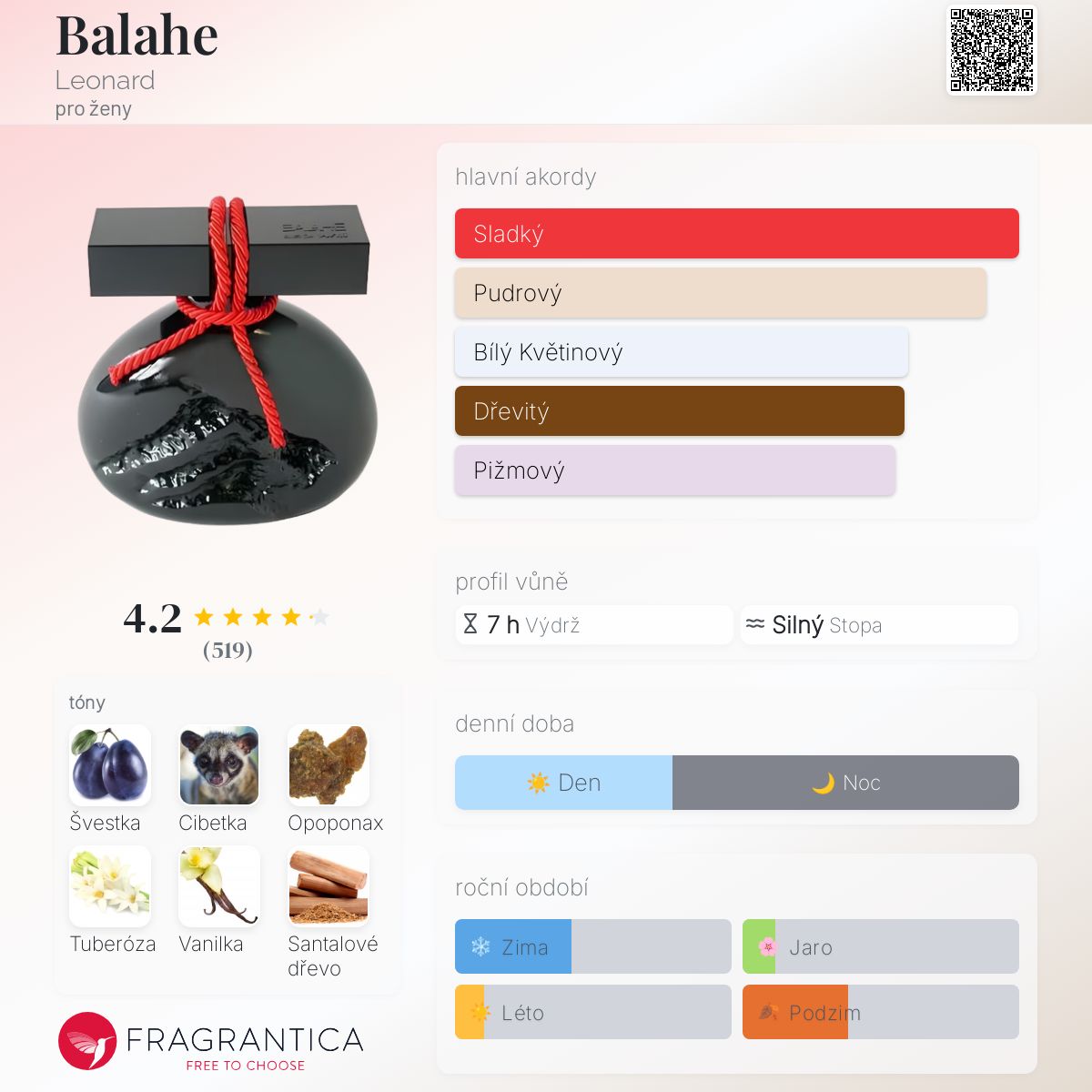 Balahe podle Leonard je Orientální Floral vůně pro ženy. Balahe byl/a uveden/a v roce 1983. "Nosem" za touto vůní je Daniel Moliere. Vrchní tóny jsou Švestka, Aldehydy, Šalvěj muškátová, Koriandr, Anýz, Ananas, Mandarinka a Bergamot; střední tóny jsouTuberóza, Orchidej, Kořen orris, Ylang-Ylang, Kosatec, Růže, Jasmín a Pomerančový květ ; základní tóny jsou Cibetka, Opoponax, Vanilka, Santalové dřevo, Pižmo a Vetiver.