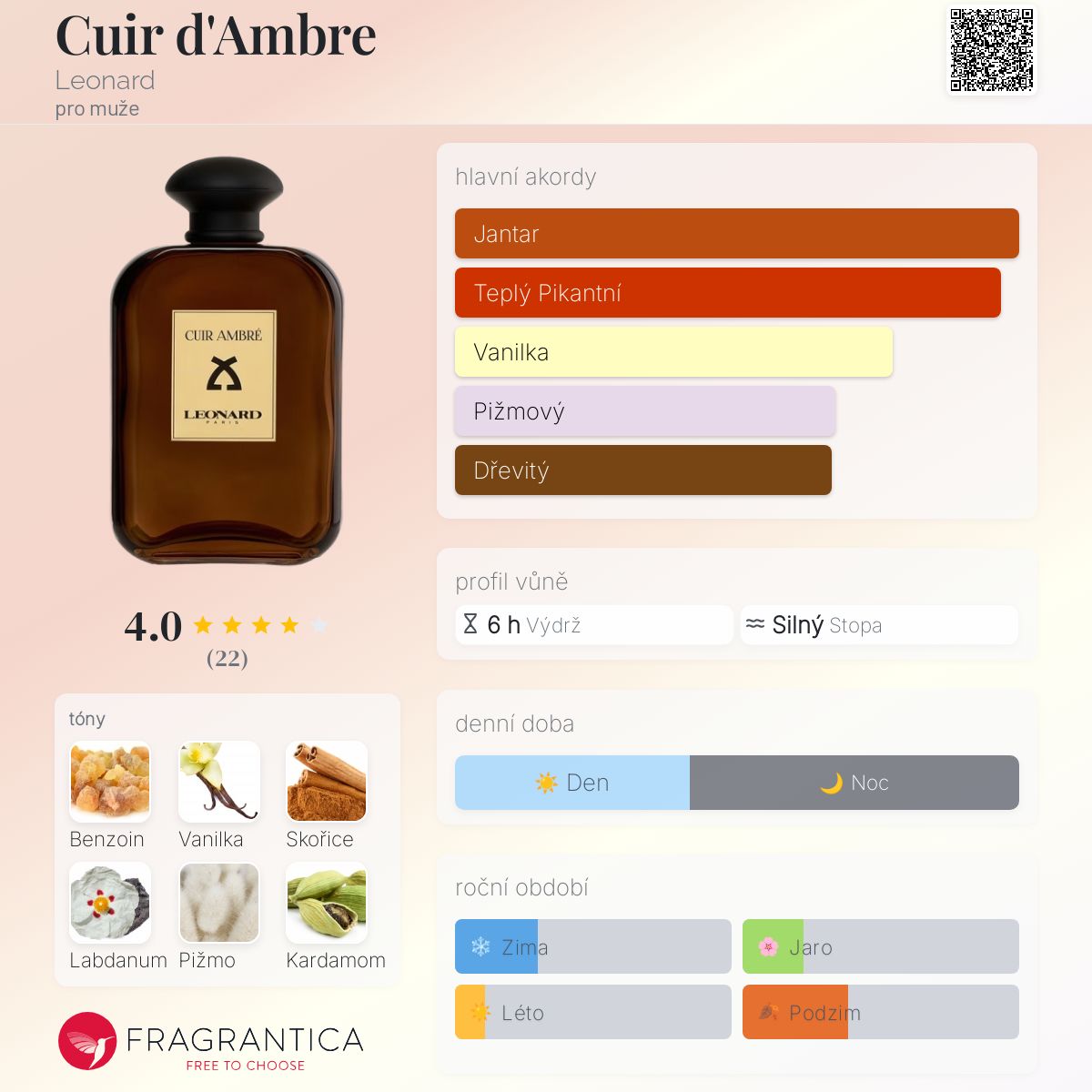Cuir d'Ambre podle Leonard je Woody Spicy vůně pro muže. Cuir d'Ambre byl/a uveden/a v roce 2018. Vrchní tóny jsou Skořice, Kardamom a Bergamot; střední tóny jsouJasmín a Růže ; základní tóny jsou Benzoin, Vanilka, Labdanum, Pižmo, Santalové dřevo, Kadidlo, Dub a Pačuli.