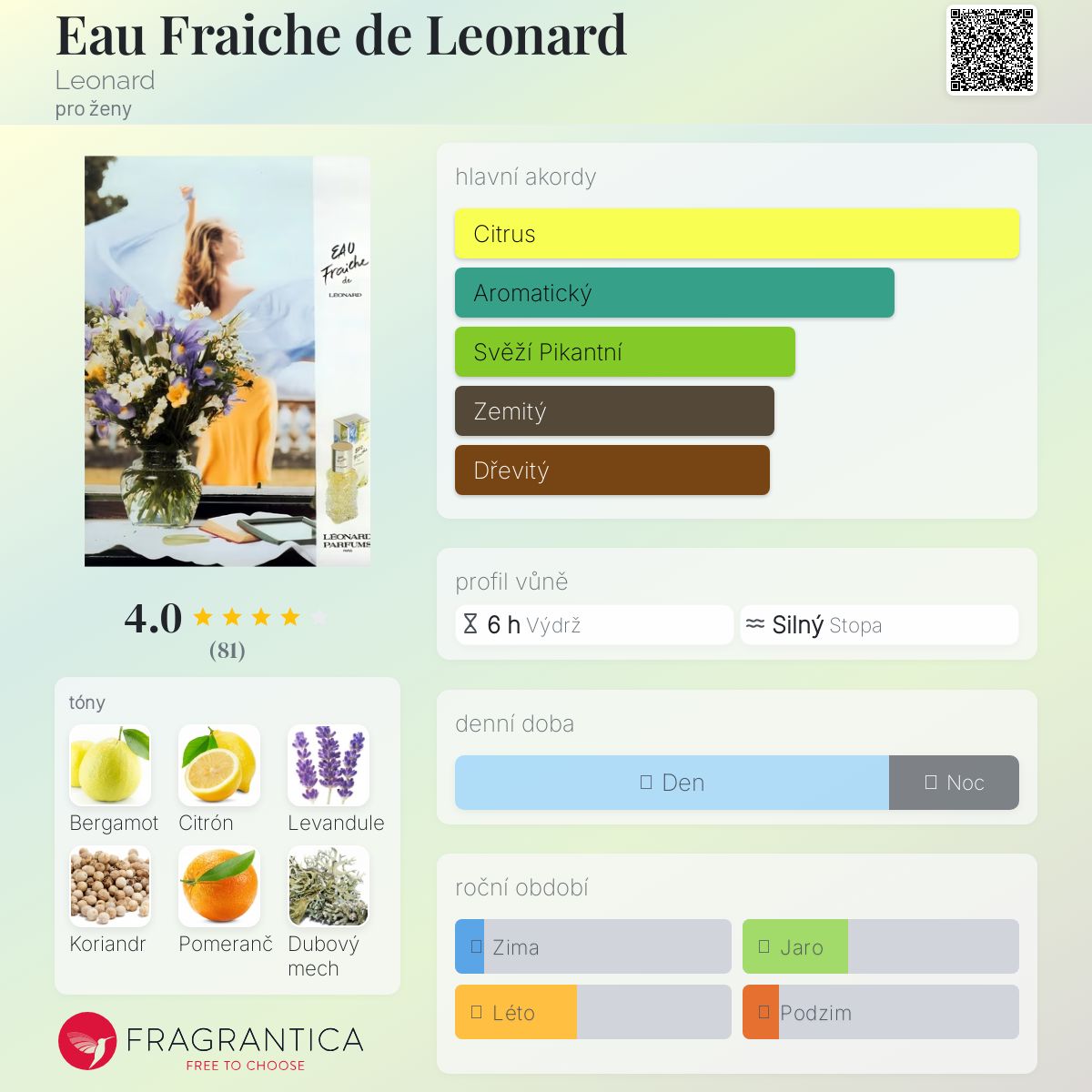Eau Fraiche de Leonard podle Leonard je Citrus Aromatic vůně pro ženy. Eau Fraiche de Leonard byl/a uveden/a v roce 1974. Vrchní tóny jsou Bergamot, Sicilský citron, Levandule, Pomeranč, Mandarinka a Švestka; střední tóny jsouKoriandr, Pelyněk, Hřebíček a Jasmín ; základní tóny jsou Dubový mech, Tahitský vetiver a Singapurské pačuli.