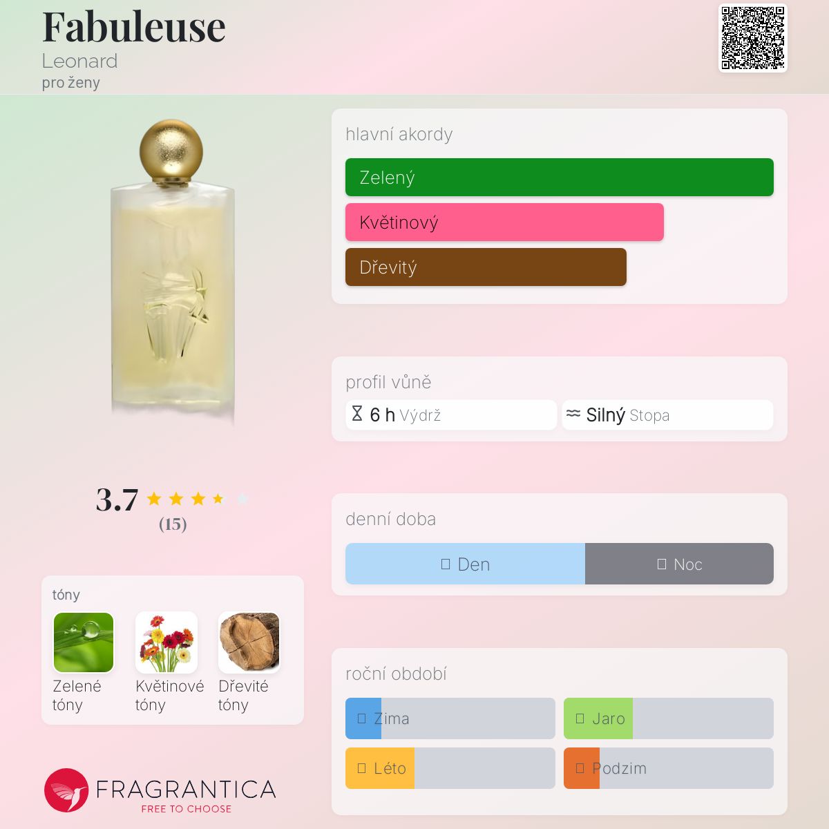 Fabuleuse podle Leonard je Floral Green vůně pro ženy. Fabuleuse byl/a uveden/a v roce 1998. Vrchní tón je Květinové tóny ; střední tón jeZelený tón ; základní tón je Dřevité tóny.