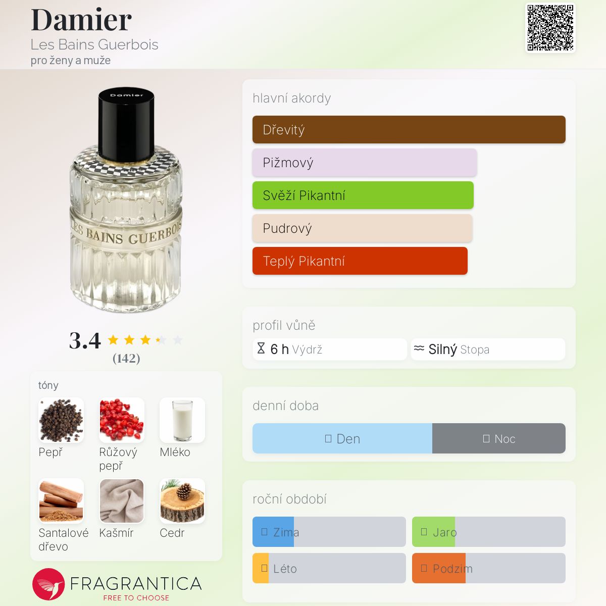 Damier podle Les Bains Guerbois je Woody Spicy vůně pro ženy a muže. Damier byl/a uveden/a v roce 2022. "Nosem" za touto vůní je Fanny Bal. Vrchní tóny jsou Černý pepř a Růžový pepř; střední tóny jsouMléko a Jasmín ; základní tóny jsou Santalové dřevo, Kašmír, Cedr, Pačuli a Bílé pižmo.