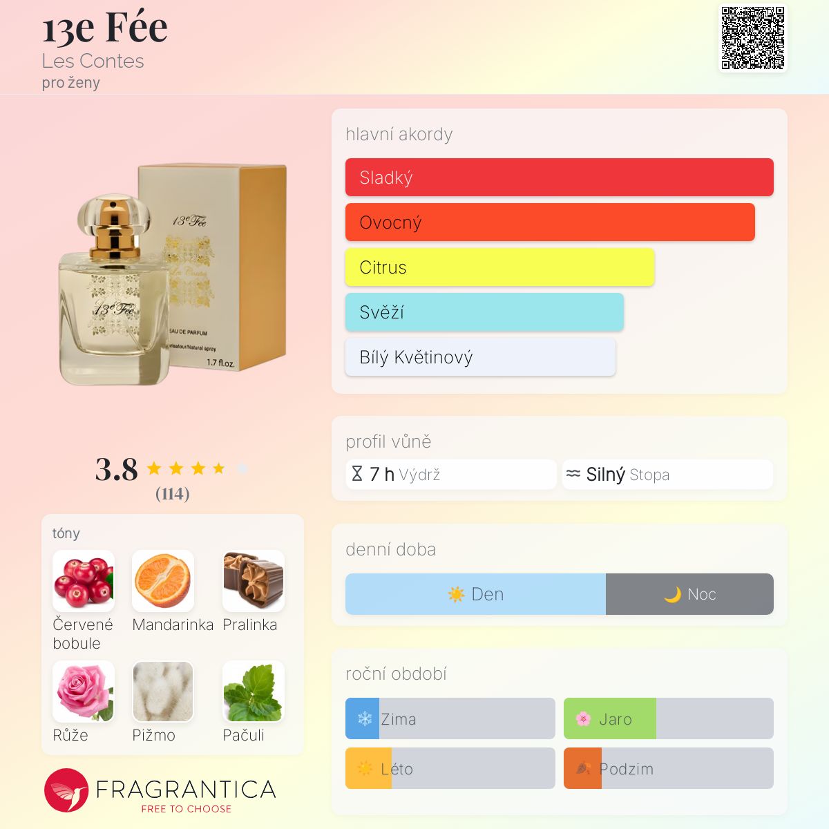 13e Fée podle Les Contes je Floral Fruity Gourmand vůně pro ženy. Vrchní tóny jsou Červené bobule a Mandarinka; střední tóny jsouRůže, Jasmín a Konvalinka ; základní tóny jsou Pralinka, Pižmo a Pačuli.