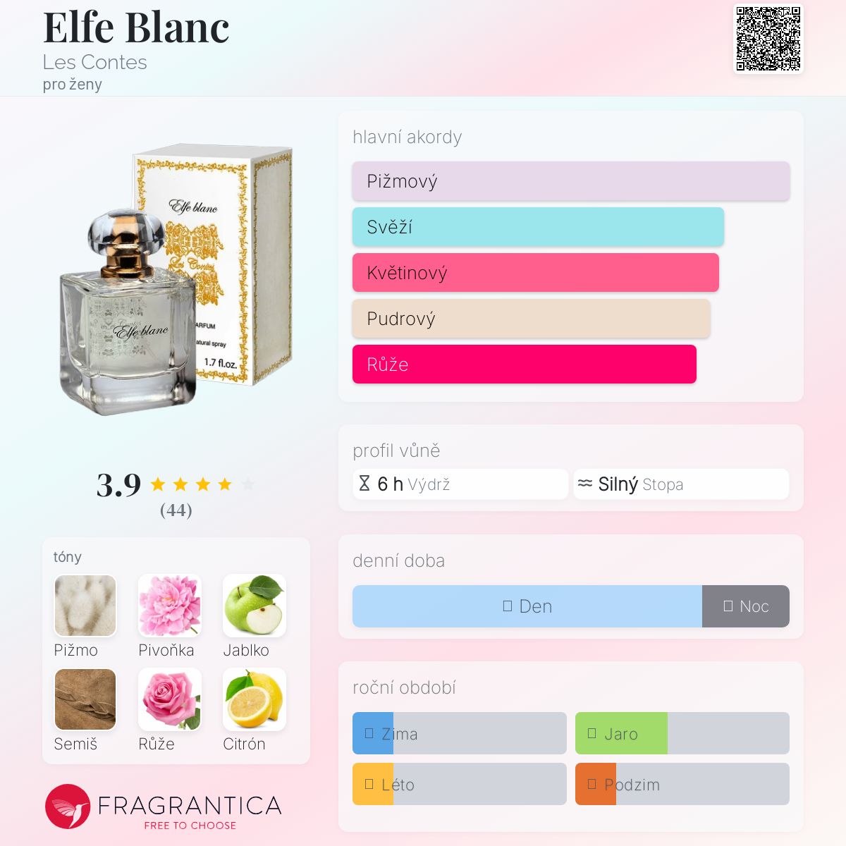 Elfe Blanc podle Les Contes je Floral Woody Musk vůně pro ženy. Elfe Blanc byl/a uveden/a v roce 2016. Vrchní tóny jsou Pivoňka, Jablko a Citrón; střední tóny jsouRůže, Fialka, Pelargónie a Karafiát ; základní tóny jsou Pižmo, Semiš, Pačuli a Vanilka.