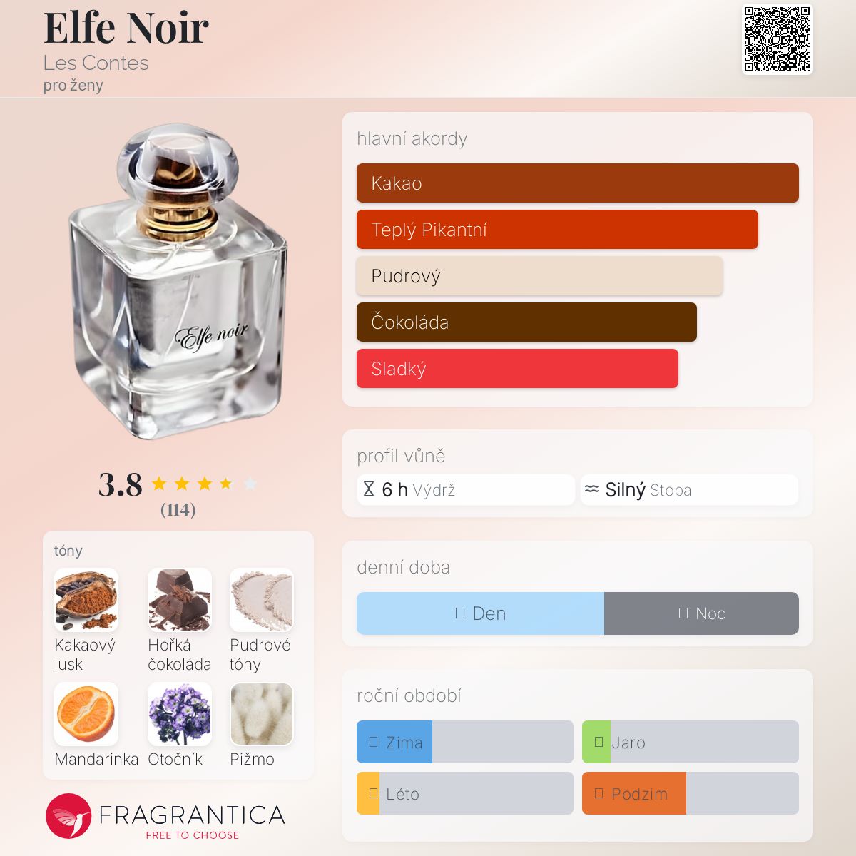 Elfe Noir podle Les Contes je Orientální Vanilla vůně pro ženy. Elfe Noir byl/a uveden/a v roce 2015. Vrchní tóny jsou Kakao a Mandarinka; střední tóny jsouHořká čokoláda a Jasmín ; základní tóny jsou Pudrové tóny, Otočník a Pižmo.