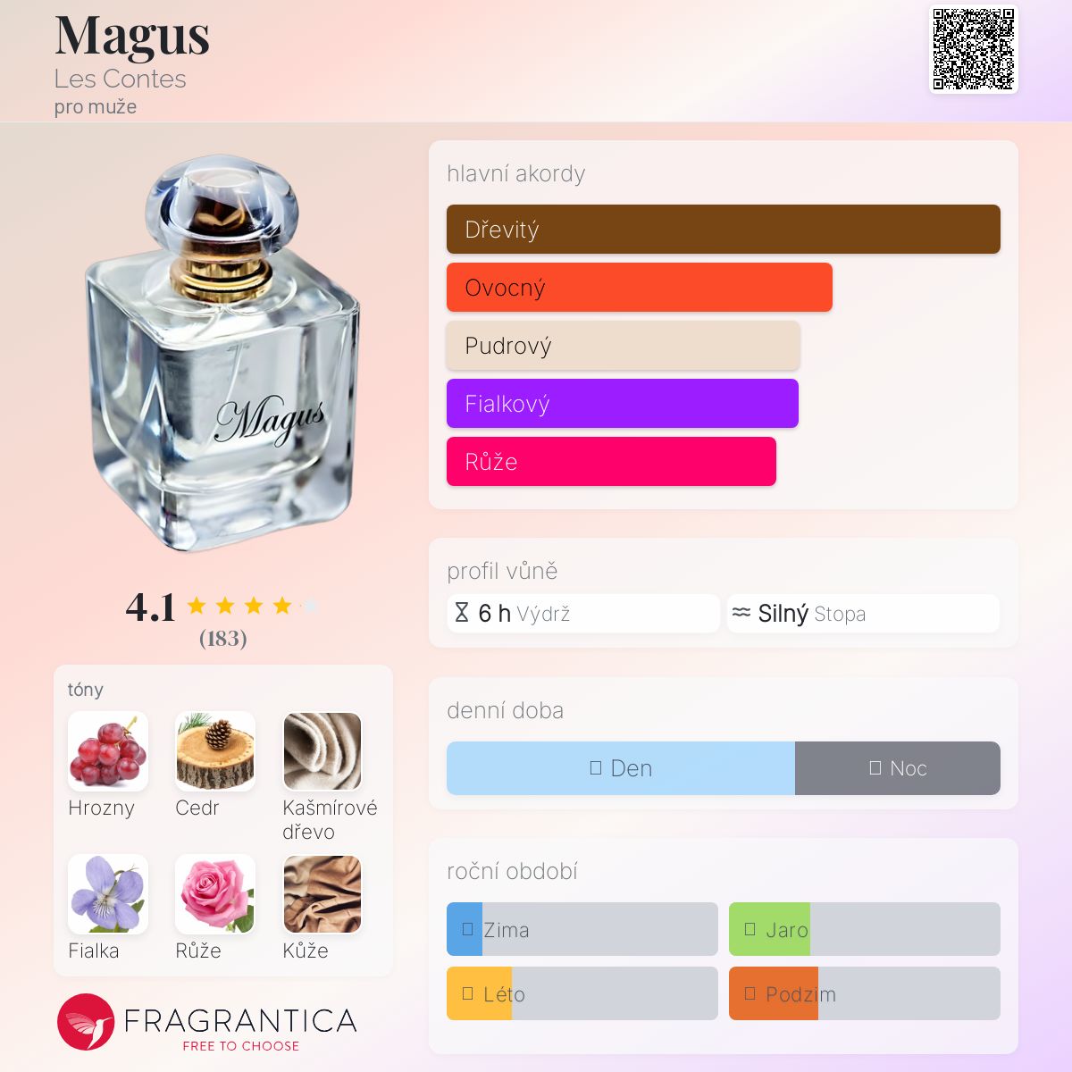 Magus podle Les Contes je Woody Aromatic vůně pro muže. Vrchní tón je Hrozny ; střední tóny jsouCedr, Fialka a Růže ; základní tóny jsou Kašmírové dřevo a Kůže.