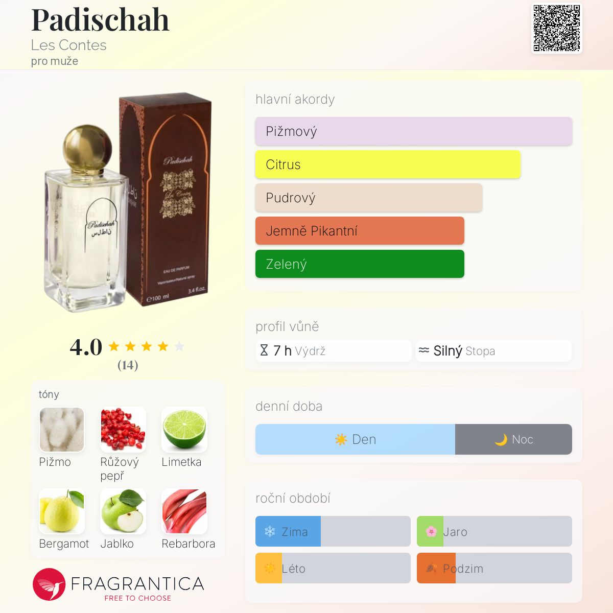 Padischah podle Les Contes je Woody Spicy vůně pro muže. Padischah byl/a uveden/a v roce 2019. Vrchní tóny jsou Růžový pepř, Limetka, Bergamot, Jablko, Rebarbora a Kaštan; střední tóny jsouBulharská růže, Pelargónie, Atlasový cedr a Skořice ; základní tóny jsou Pižmo, Santalové dřevo, Vetiver, Kadidlo a Jantar (ambra).