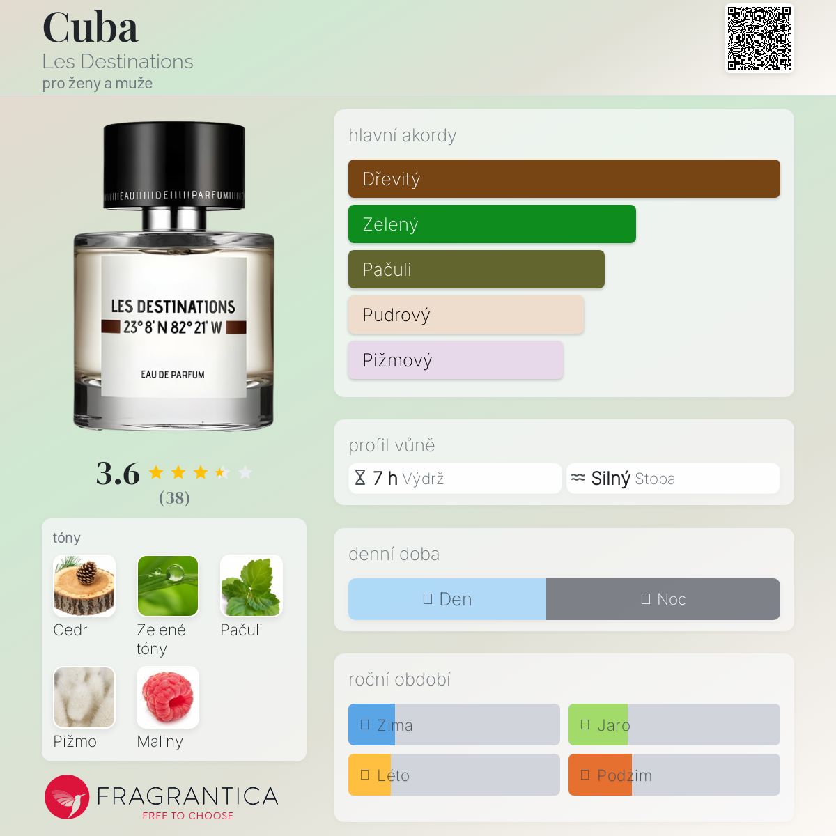 Cuba podle Les Destinations je Orientální Woody vůně pro ženy a muže. Cuba byl/a uveden/a v roce 2021. Vrchní tóny jsou Zelený tón a Maliny; střední tón jeCedr ; základní tóny jsou Pačuli a Pižmo.