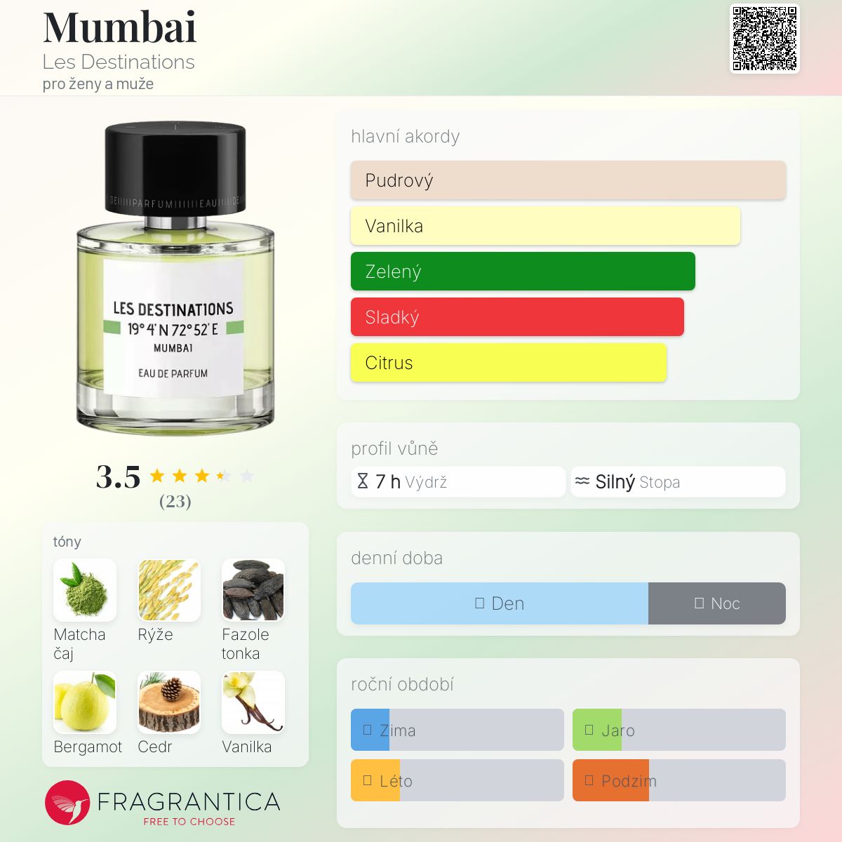 Mumbai podle Les Destinations je Floral Woody Musk vůně pro ženy a muže. Mumbai byl/a uveden/a v roce 2023. "Nosem" za touto vůní je Daniela Marty. Vrchní tóny jsou Matcha čaj, Rýže a Bergamot; střední tóny jsouFazole tonka, Růže a Brambořík ; základní tóny jsou Cedr, Vanilka a Pižmo.