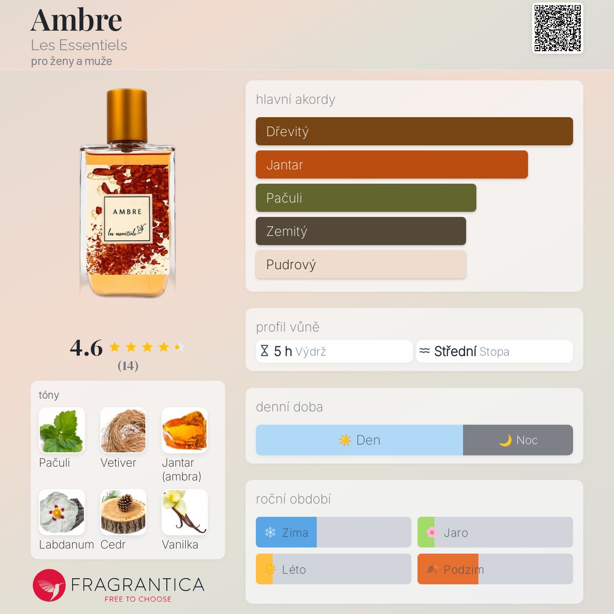 Ambre podle Les Essentiels je Orientální Woody vůně pro ženy a muže. Ambre byl/a uveden/a v roce 2022. Vrchní tóny jsou Pudrové tóny a Badyán; střední tóny jsouJantar (ambra), Vetiver a Cedr ; základní tóny jsou Pačuli, Labdanum a Vanilka.