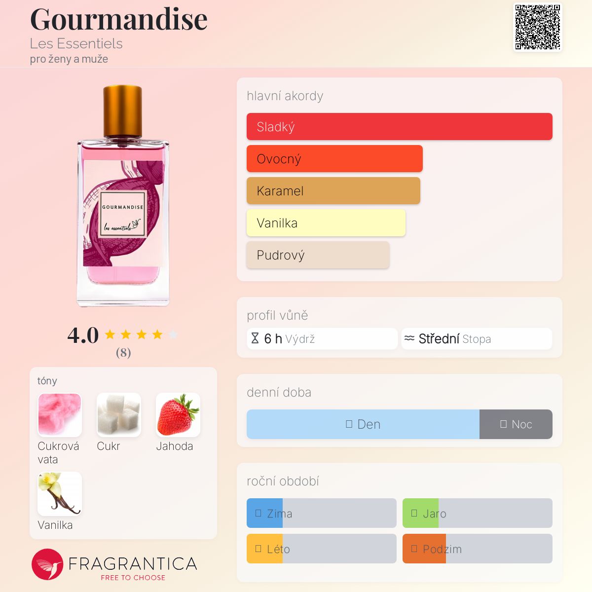 Gourmandise podle Les Essentiels je Floral Fruity Gourmand vůně pro ženy a muže. Gourmandise byl/a uveden/a v roce 2022. Vrchní tón je Jahoda ; střední tóny jsouCukrová vata a Vanilka ; základní tón je Cukr.